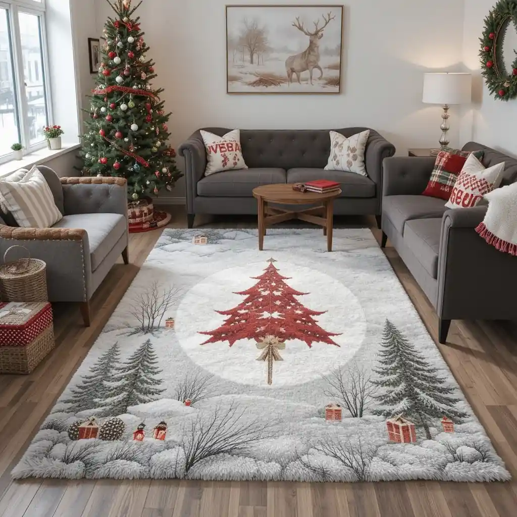 Introduce holiday-themed rugs or throws in lounge areas. Soft textures and seasonal designs provide comfort while complementing the festive theme.