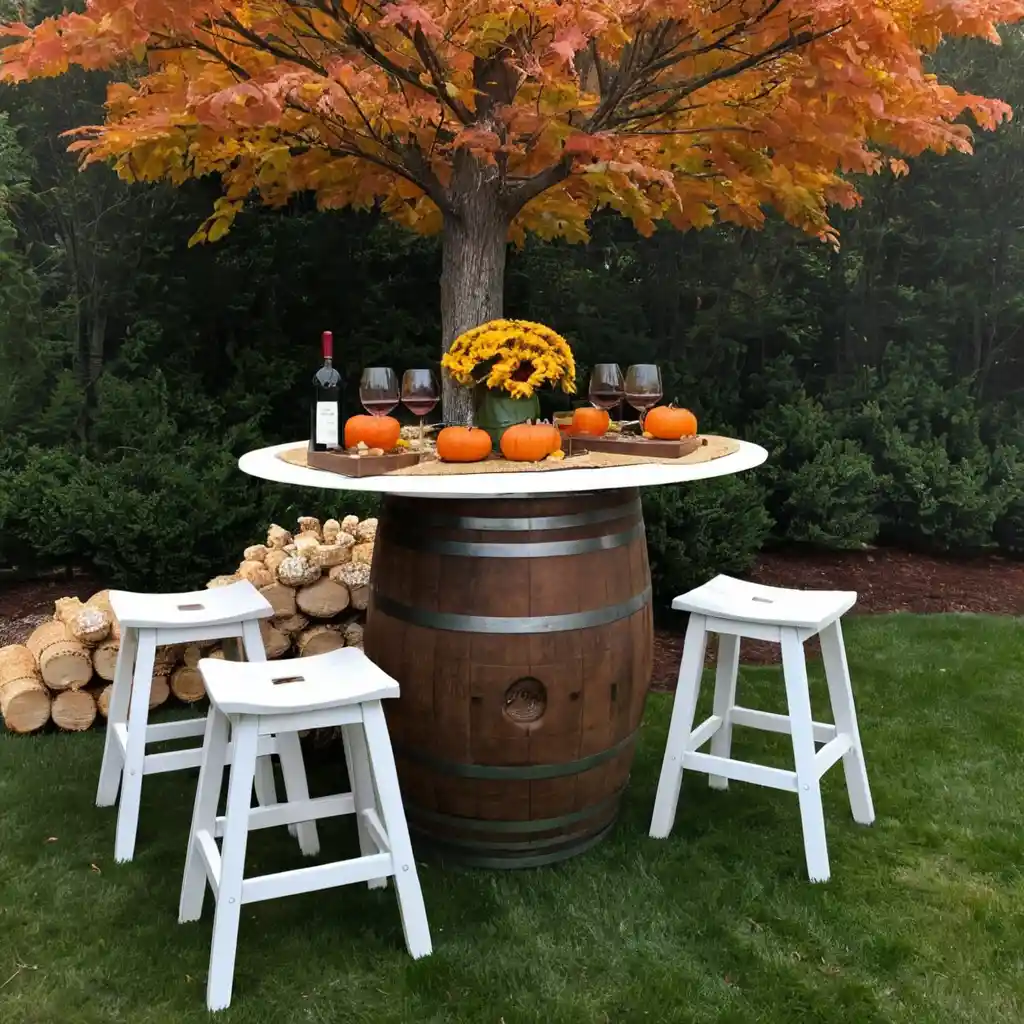 Use a wine barrel as a table and pair it with stools for a casual sitting spot. It works beautifully for enjoying drinks and snacks outdoors.