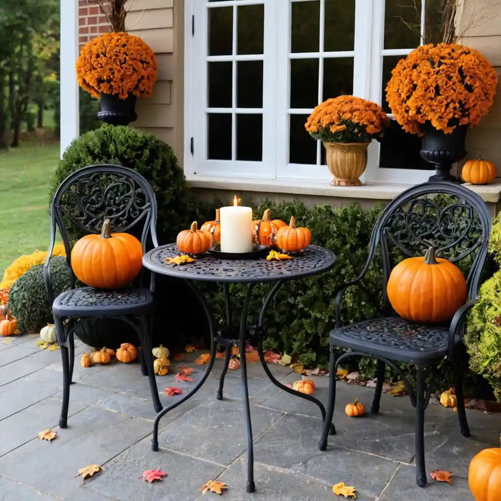 Take a small bistro table and chairs and decorate with mini pumpkins, fall leaves, and candles. It’s ideal for enjoying morning coffee outdoors.