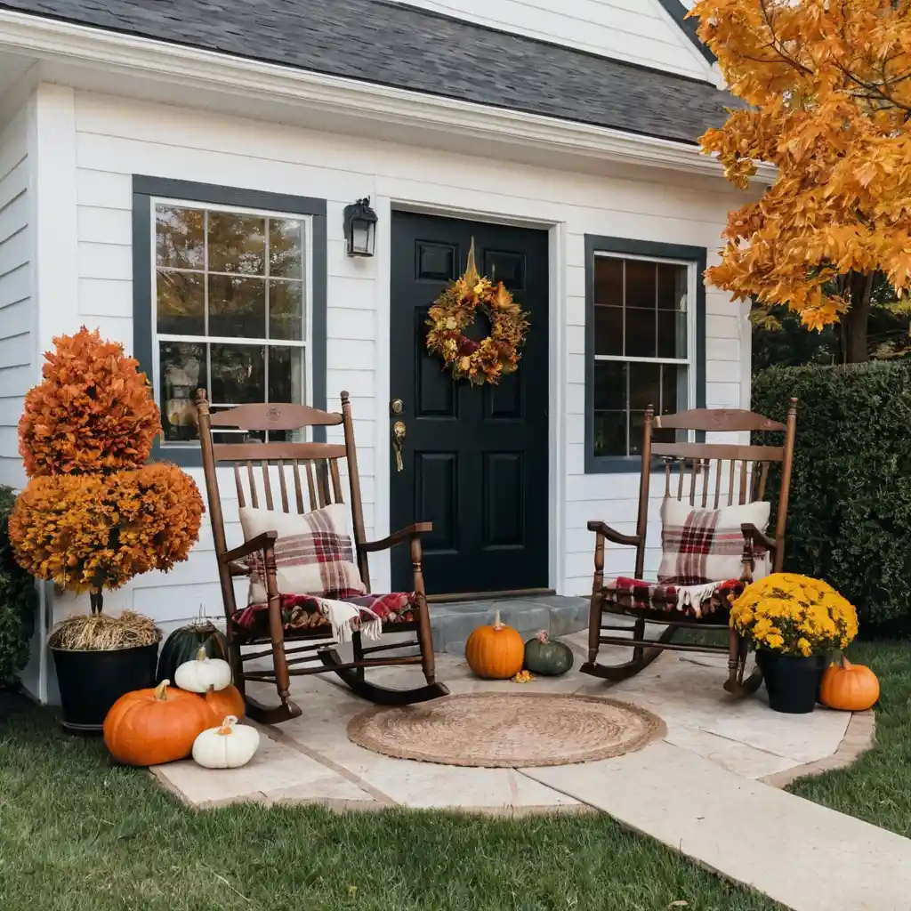 Two wooden rocking chairs in a corner create a classic fall sitting space. Add plaid pillows and a small side table for hot drinks.