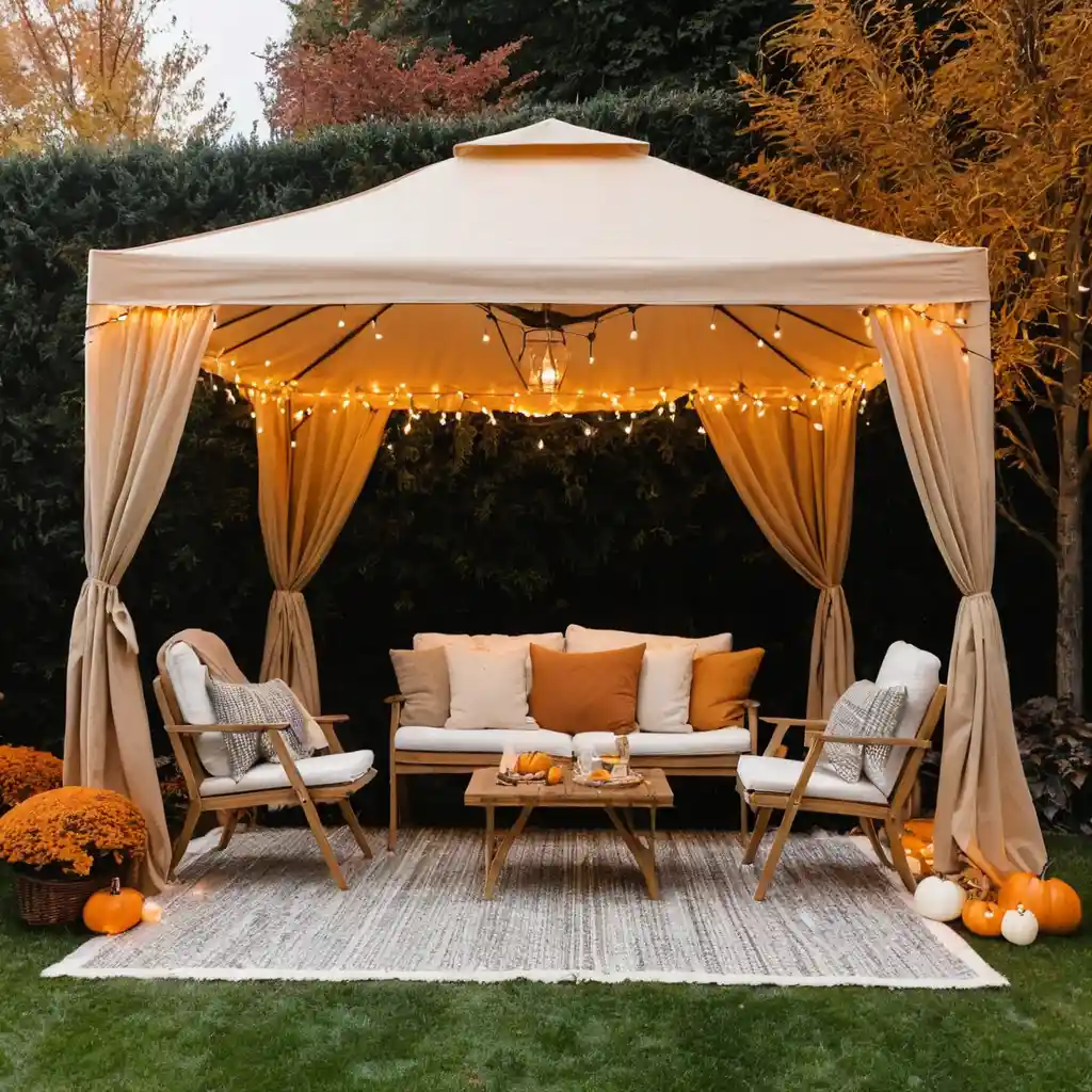 Turn your gazebo into a fall hideaway by adding a loveseat, pillows, and hanging lanterns. Surround it with pumpkins and seasonal plants.