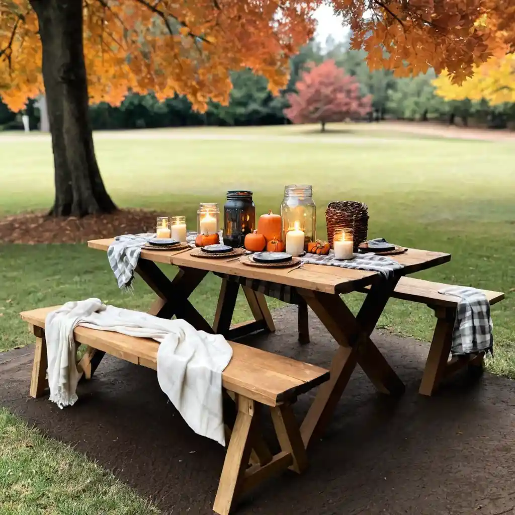 Drape blankets over benches at your picnic table for comfort and warmth. Add mason jar candles for a rustic glow.