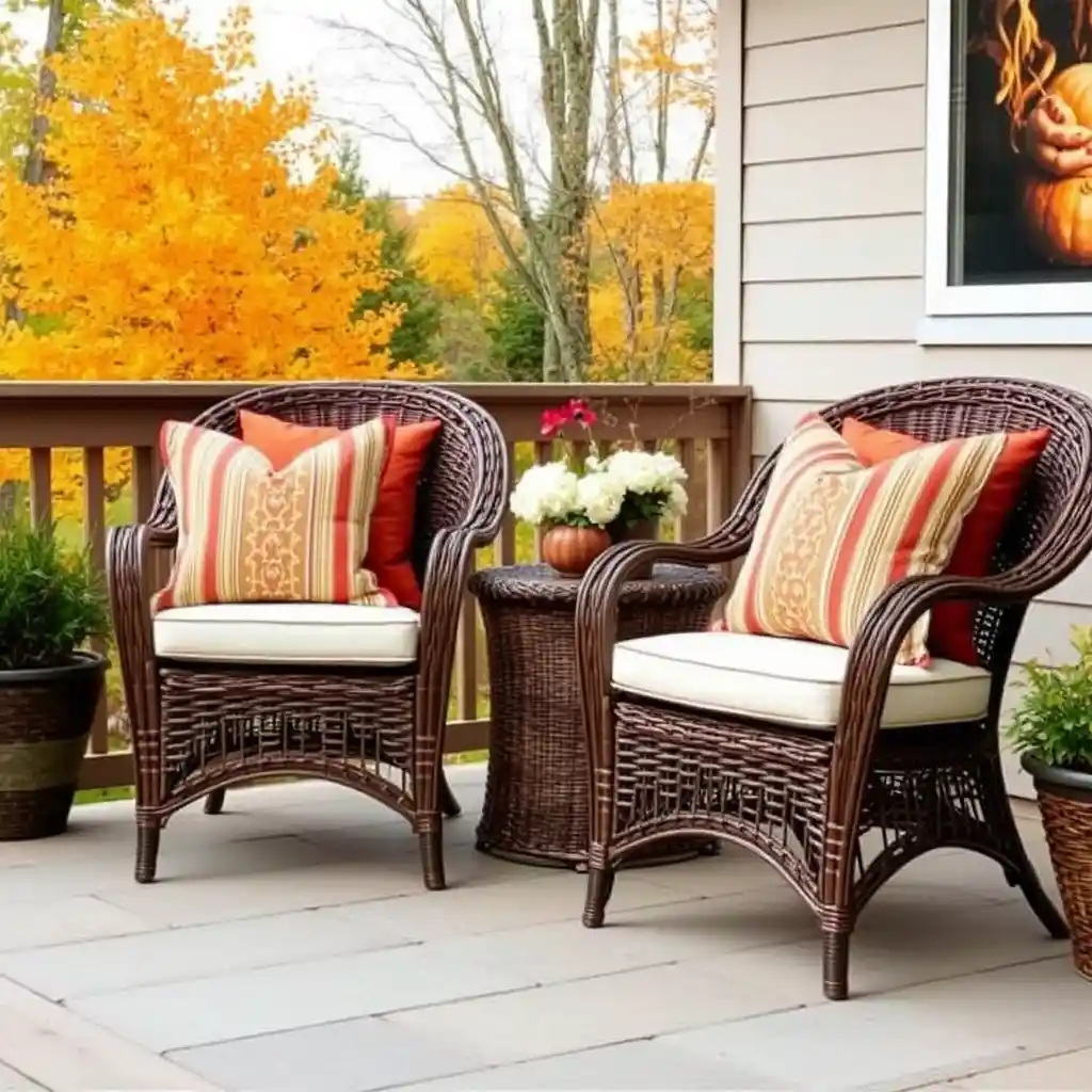 Switch your summer cushions for burnt orange, deep red, or mustard yellow pillows. Wicker chairs bring a casual, natural feel that blends well with fall’s earthy tones.