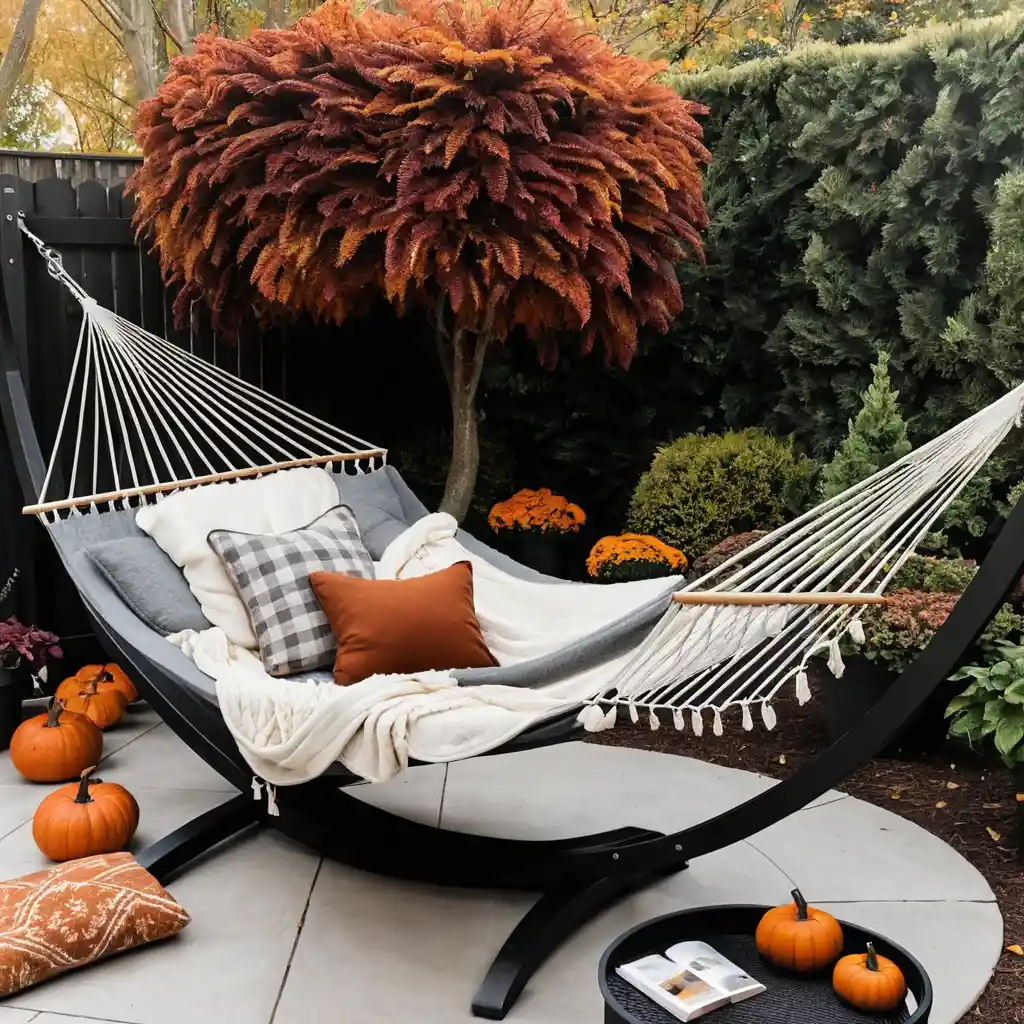 Even in cooler weather, a hammock can be a cozy spot. Drape it with fleece throws and surround it with potted mums for a seasonal touch.