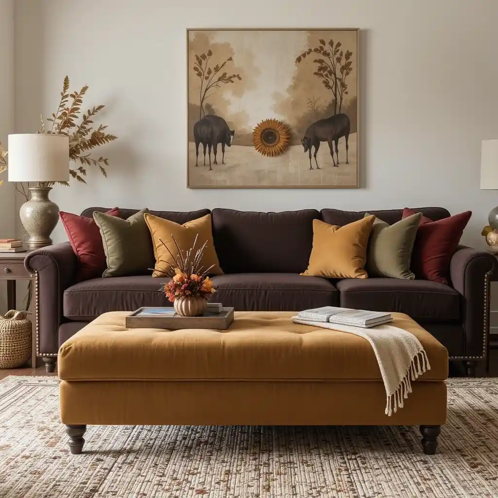 Velvet pillows or ottomans bring luxe warmth to any living room. Choose seasonal tones like maroon, goldenrod, or olive green for a cozy luxe look.
