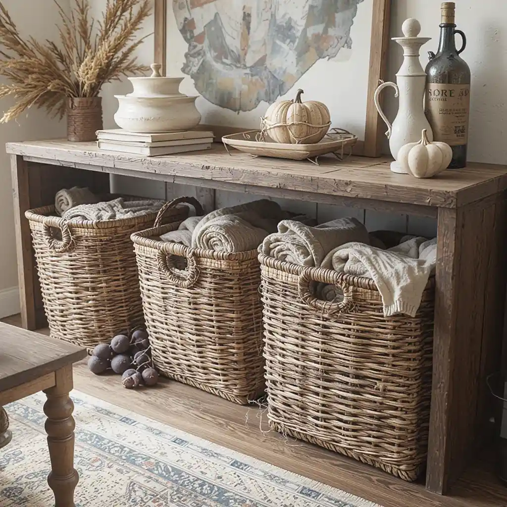 Tuck away extra blankets or magazines in rustic woven baskets. They offer practical storage while adding texture and warmth to the space.
