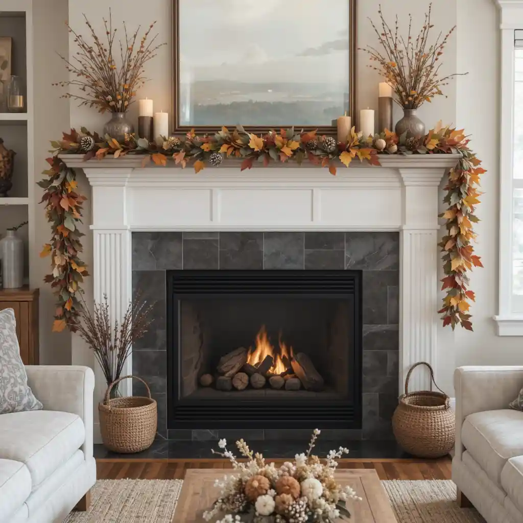 Drape faux leaf garlands or eucalyptus across your mantel. Add candles, pinecones, or twinkle lights to enhance the seasonal ambiance.