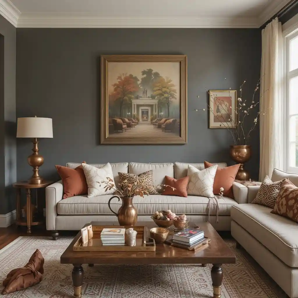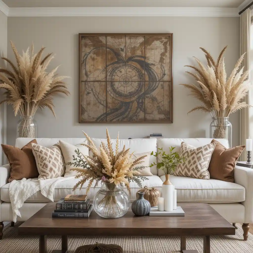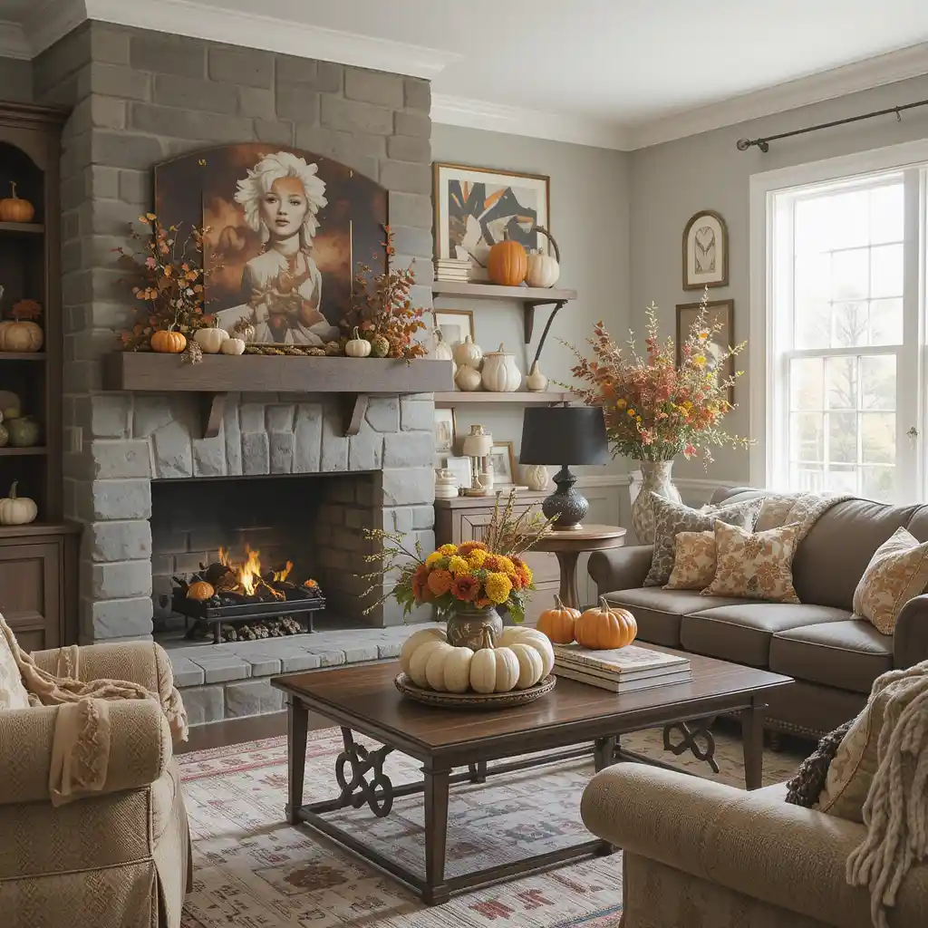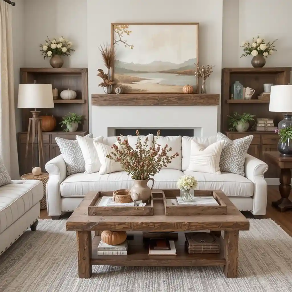 Use wooden coffee tables, trays, or wall accents to bring rustic autumn charm into your living room. Reclaimed wood adds a beautiful natural texture.