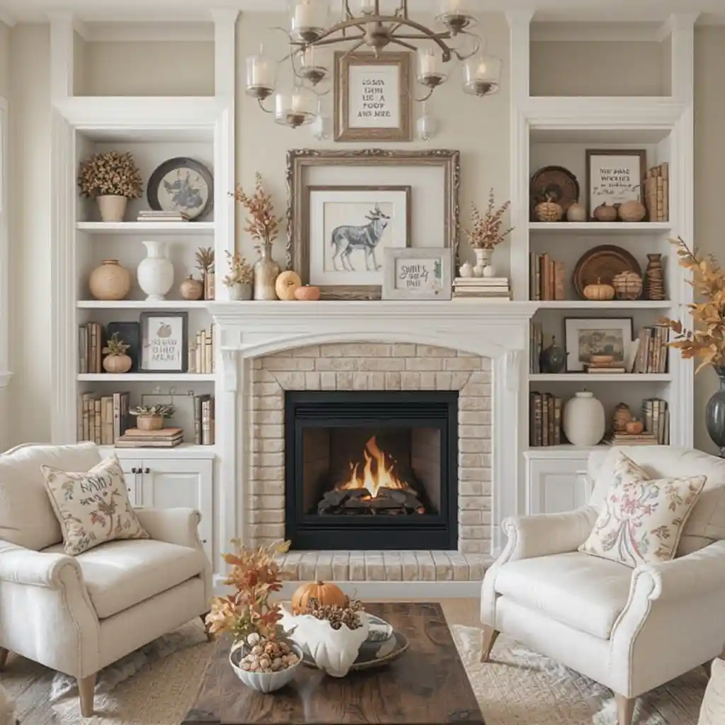 Use small framed prints of fall quotes, acorns, or woodland animals. Mixing these into your bookshelf styling brings subtle seasonal joy.