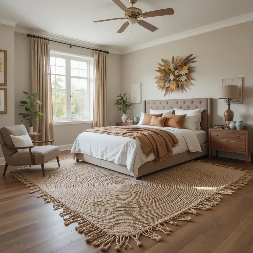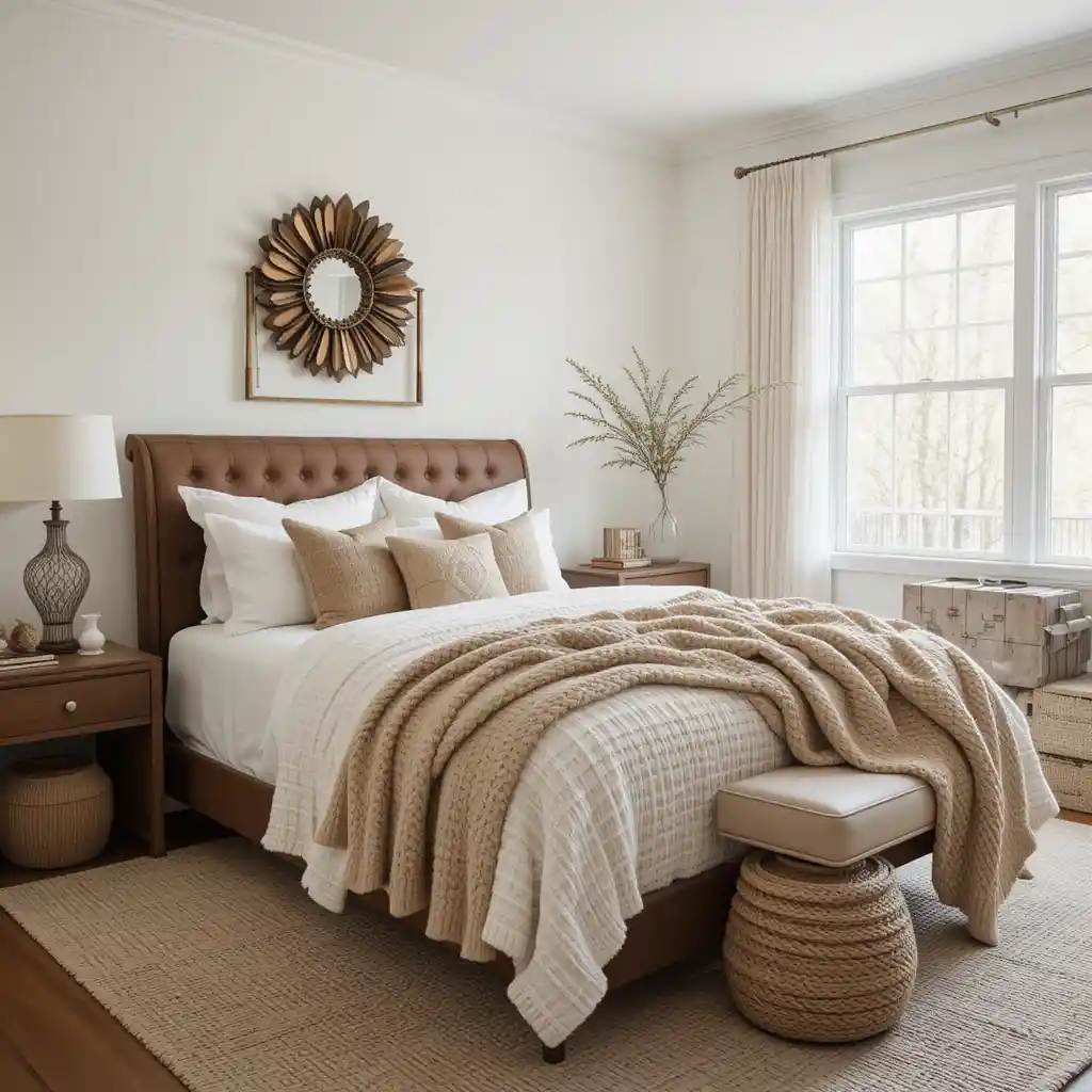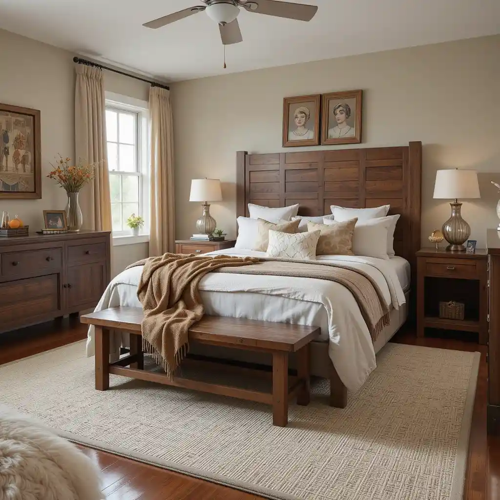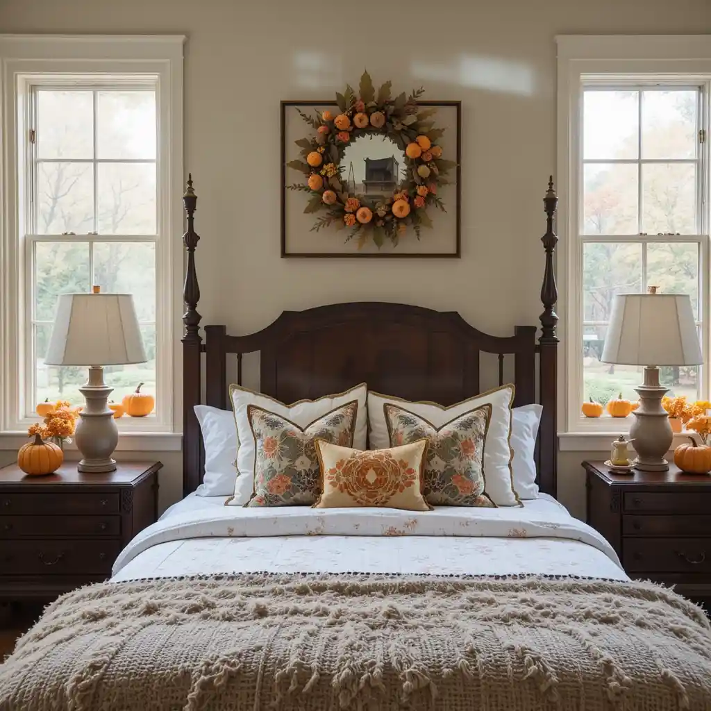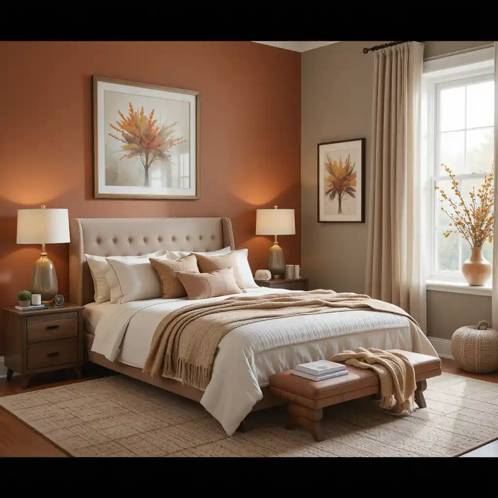 Swap in a reclaimed wood headboard or place a rustic bench at the foot of your bed. These elements ground the room in earthy, autumnal charm.