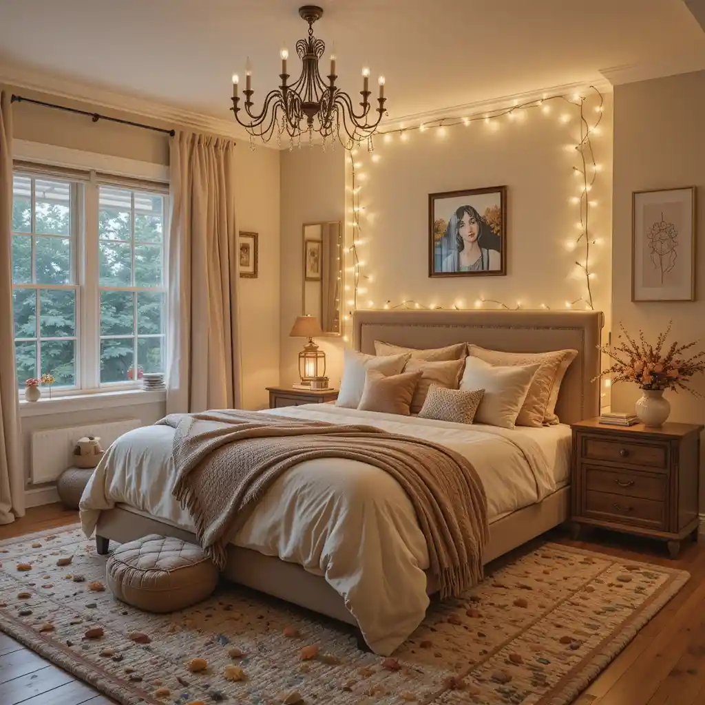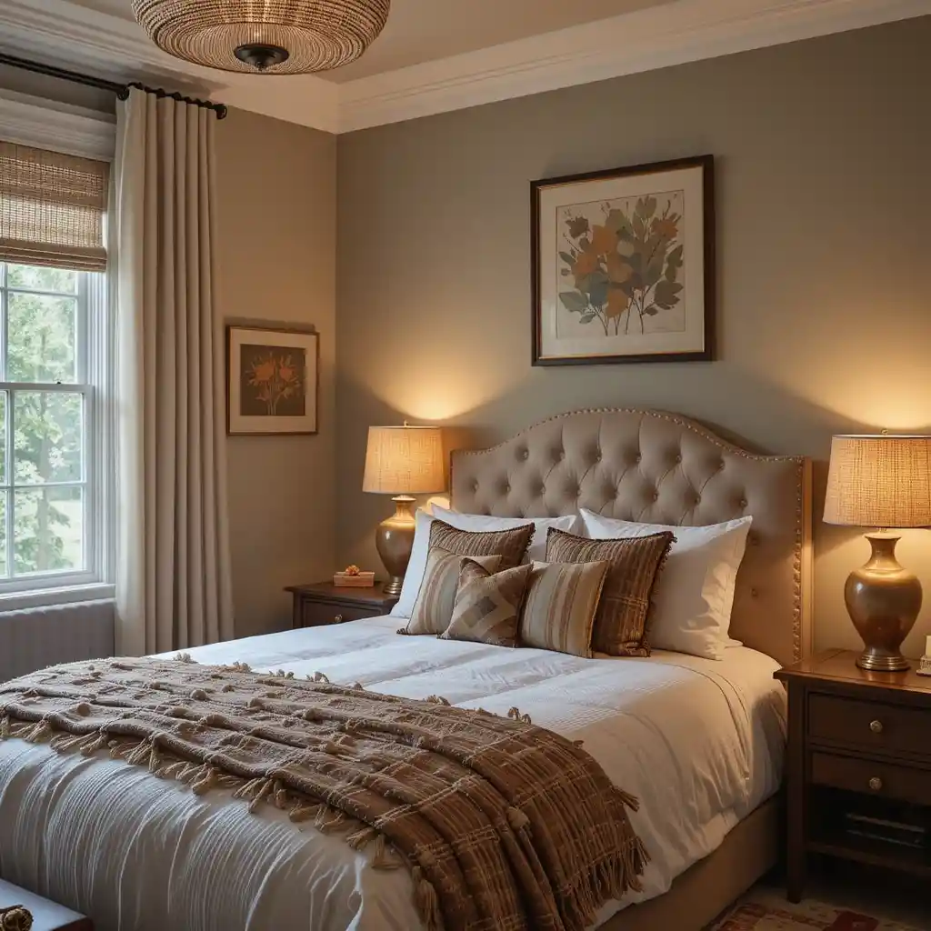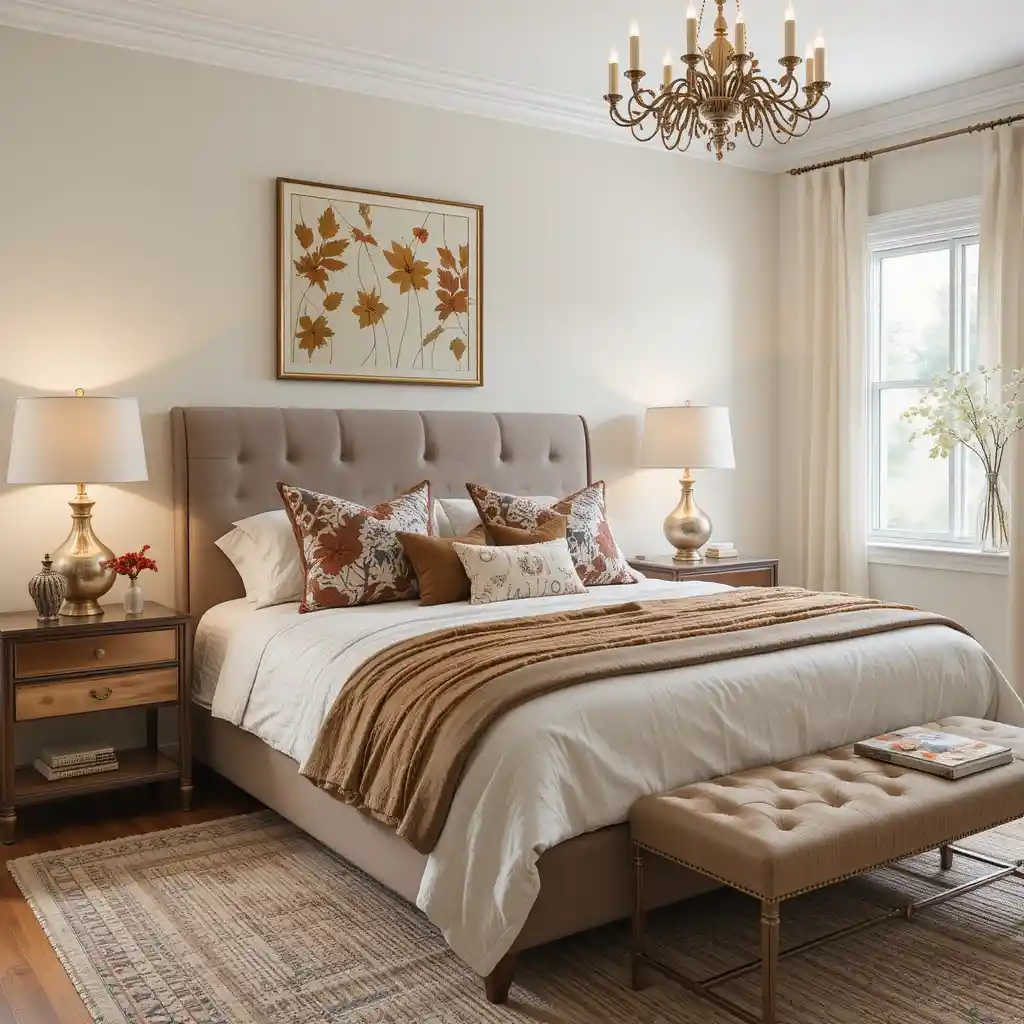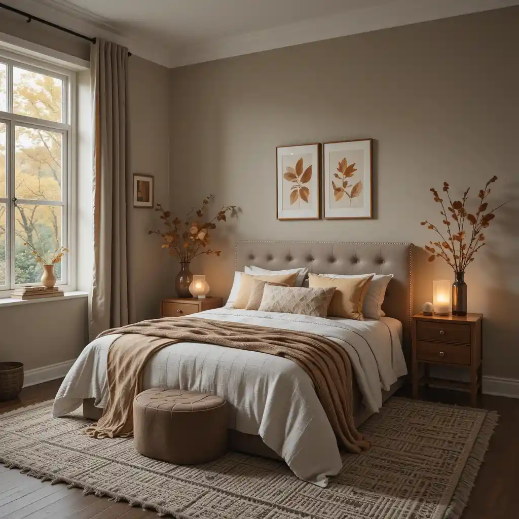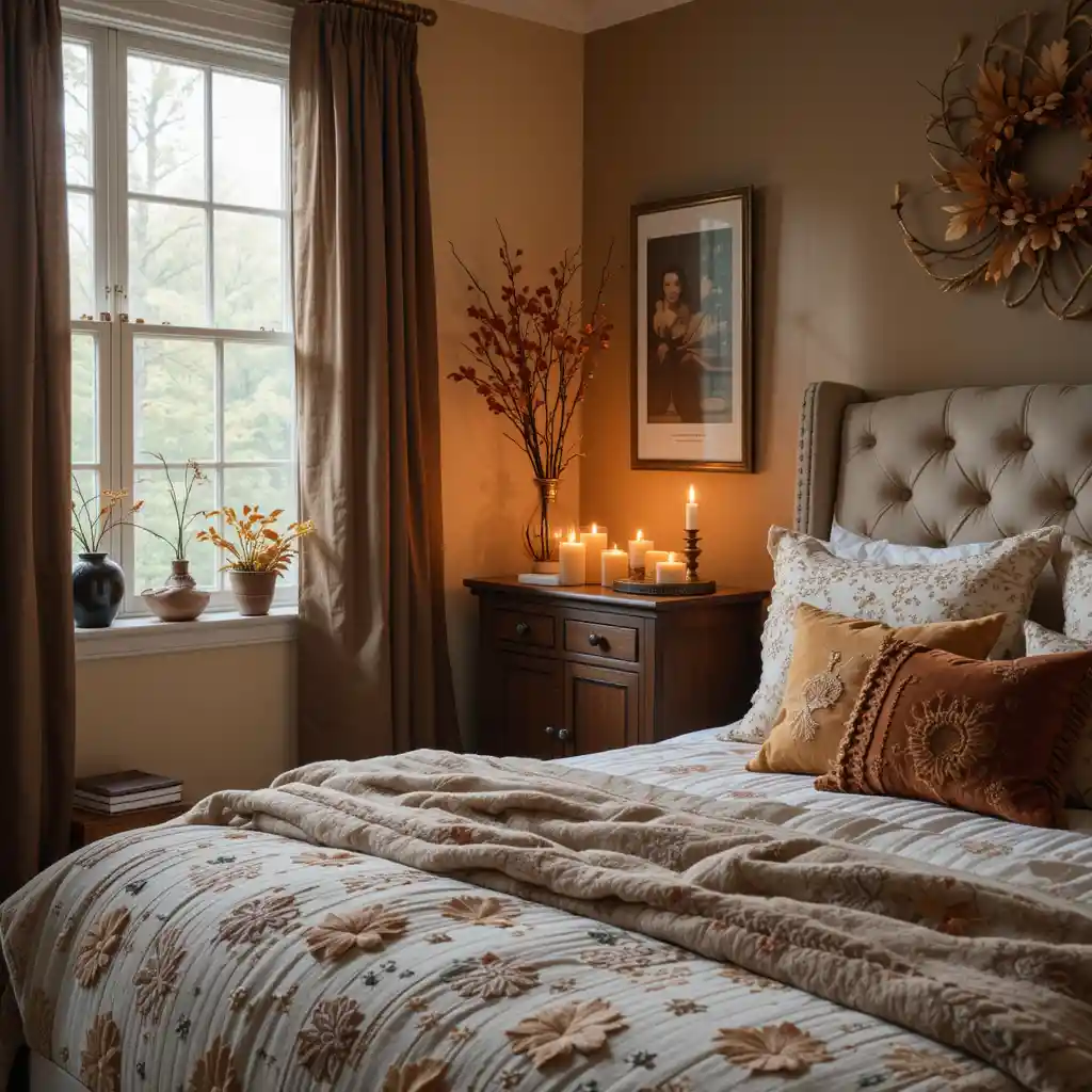 Place warm-toned table lamps with linen or rattan shades on your bedside tables. Dim lighting is essential for creating that soft, cozy autumn glow.
