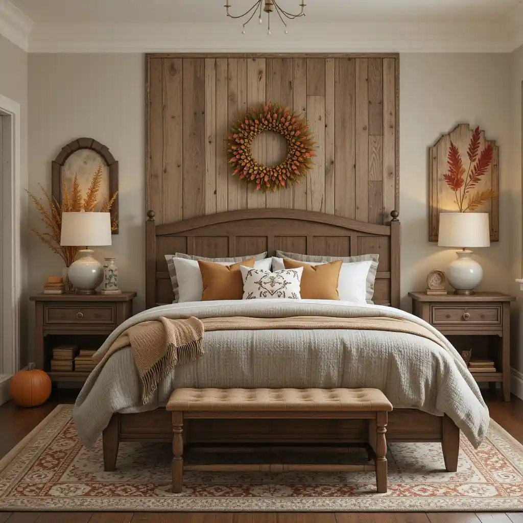 Incorporate wooden elements like nightstands, wall panels, or decor to enhance a natural, seasonal look. Distressed finishes work best for an autumn farmhouse vibe.