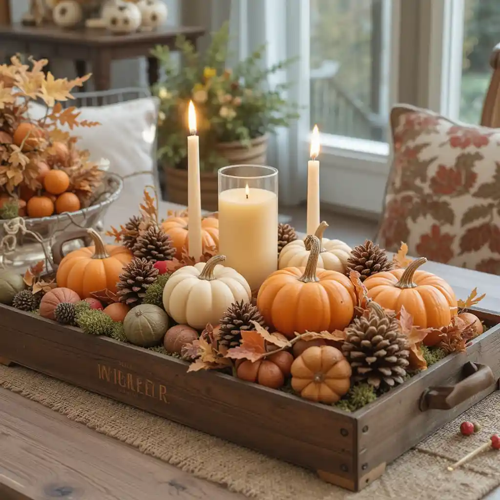 Fill a wooden tray with mini pumpkins, pinecones, and candles for a stunning seasonal centerpiece.
