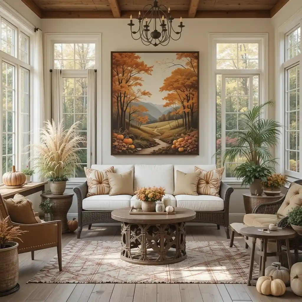 Hang artwork that reflects fall landscapes, golden leaves, or harvest themes. This ties the whole seasonal look together.