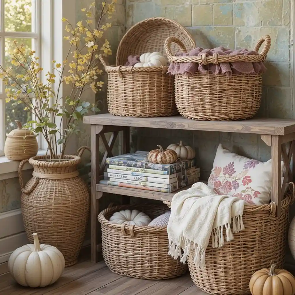 Use woven baskets to store blankets, books, or magazines. They keep your space tidy while adding a rustic fall touch.