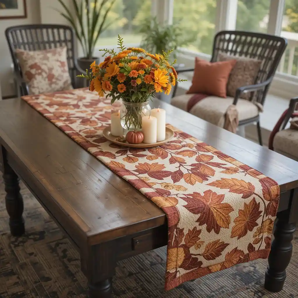 Dress up your coffee or console table with autumn-themed runners featuring leaf prints or deep earth tones.