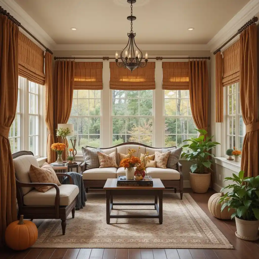Replace light summer drapes with rich, textured curtains in earthy tones. This helps block chilly air while enhancing the cozy atmosphere of your sunroom.