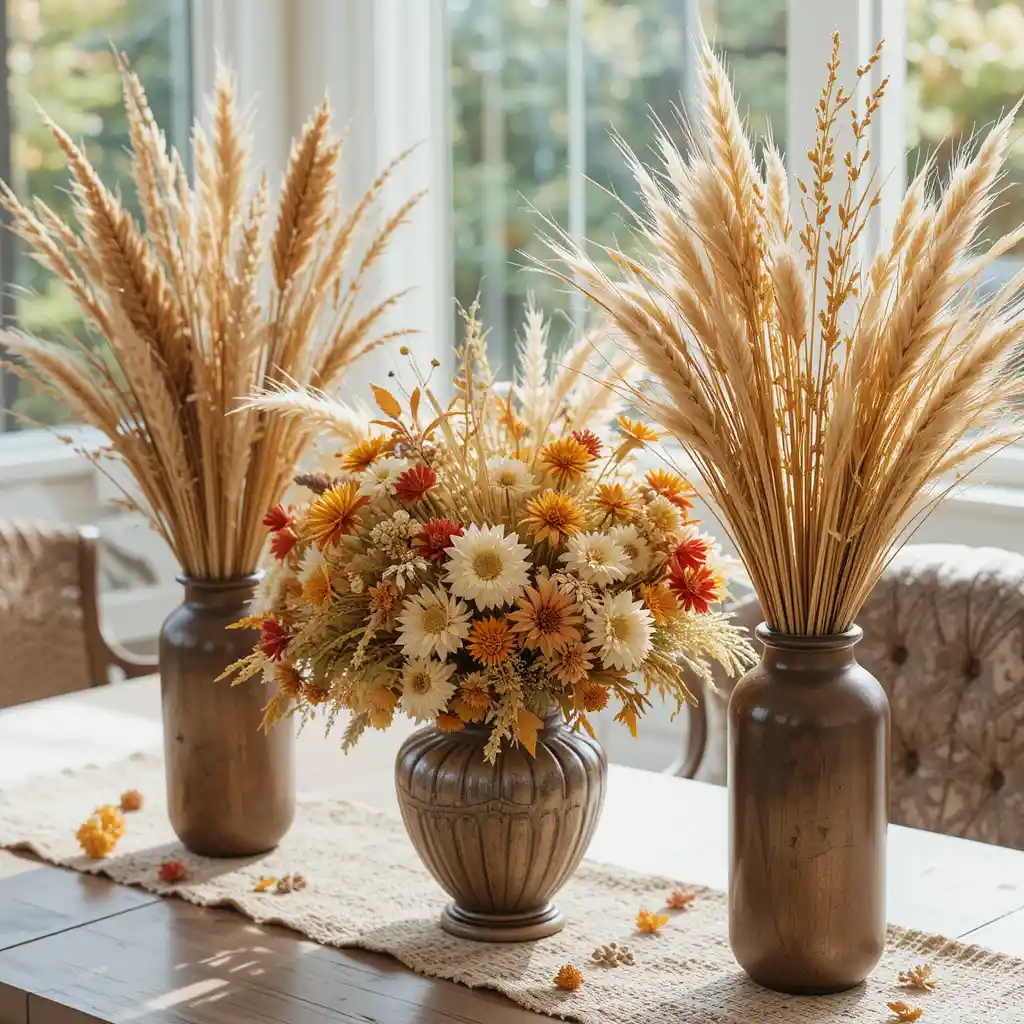 Place dried flowers, wheat stalks, or pampas grass in rustic vases for a natural fall centerpiece. They add texture and last all season without maintenance.