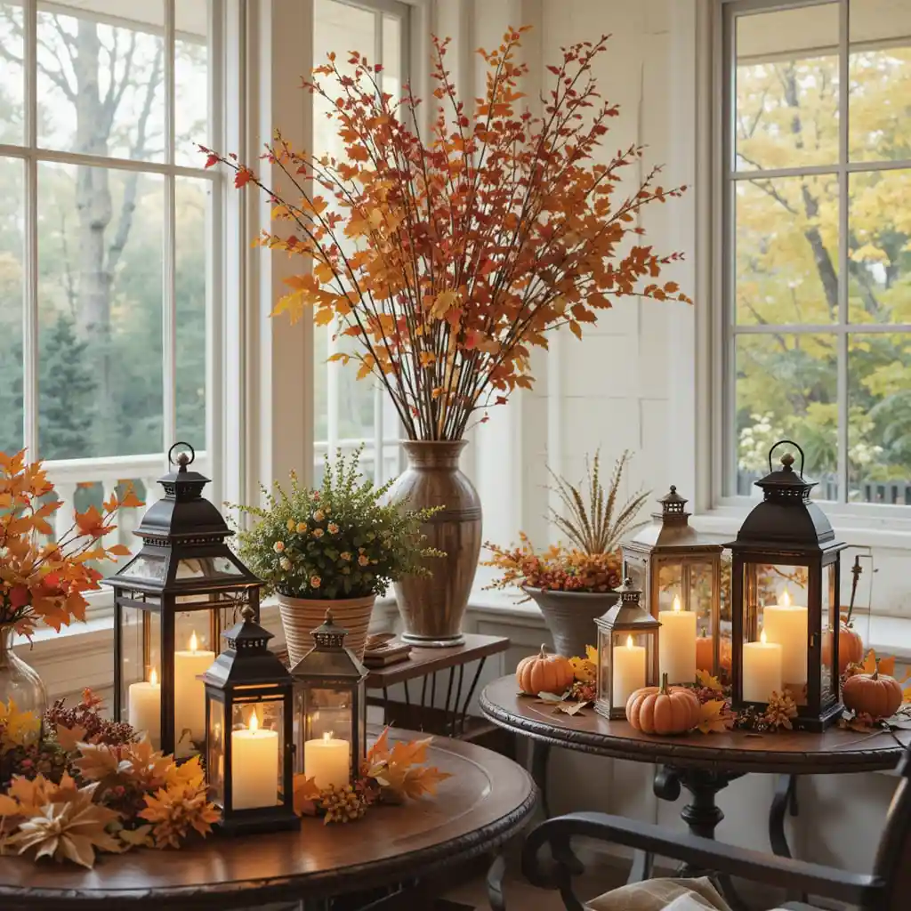 Group lanterns with LED candles or real ones on tables and corners. They create a warm, flickering light that’s perfect for cozy fall evenings.