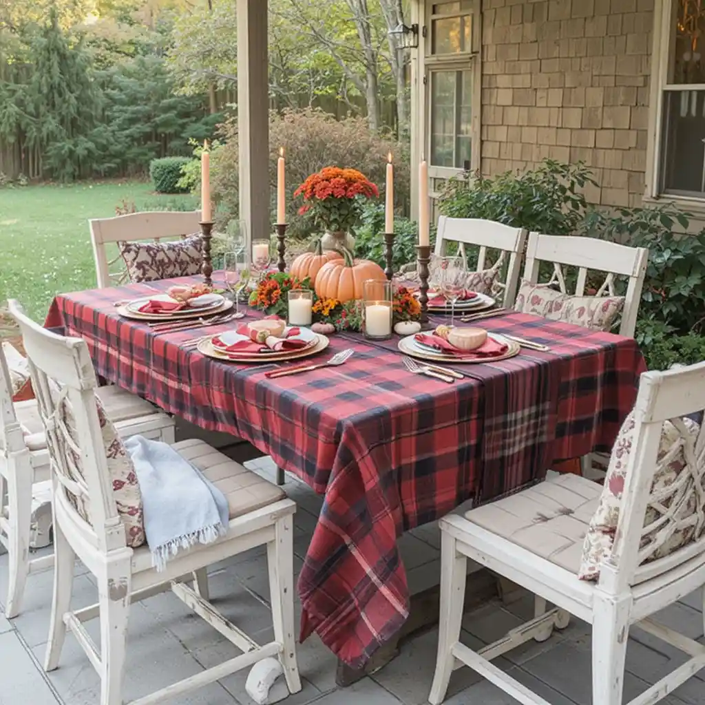 Dress up an outdoor table with a plaid tablecloth, candles, and a pumpkin centerpiece. It’s perfect for cozy gatherings and adds a festive touch to your yard décor.