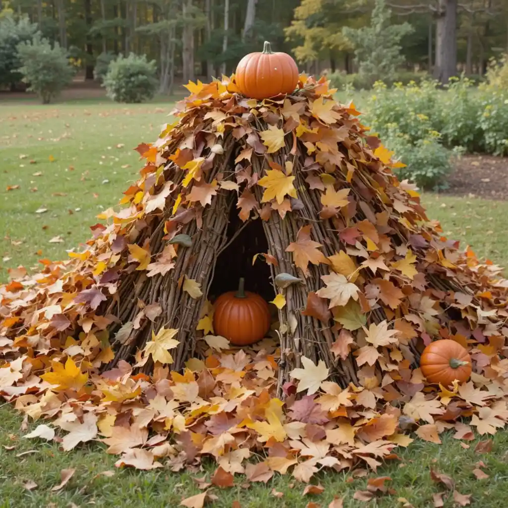 Gather fallen leaves into a large decorative pile and add hidden pumpkin accents within. It becomes both a playful family spot and a charming fall yard focal point.