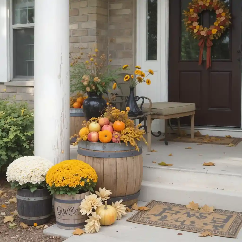 Use wooden barrels filled with apples as decorative accents near the porch or seating area. Pair them with mums for a wholesome harvest-inspired look.