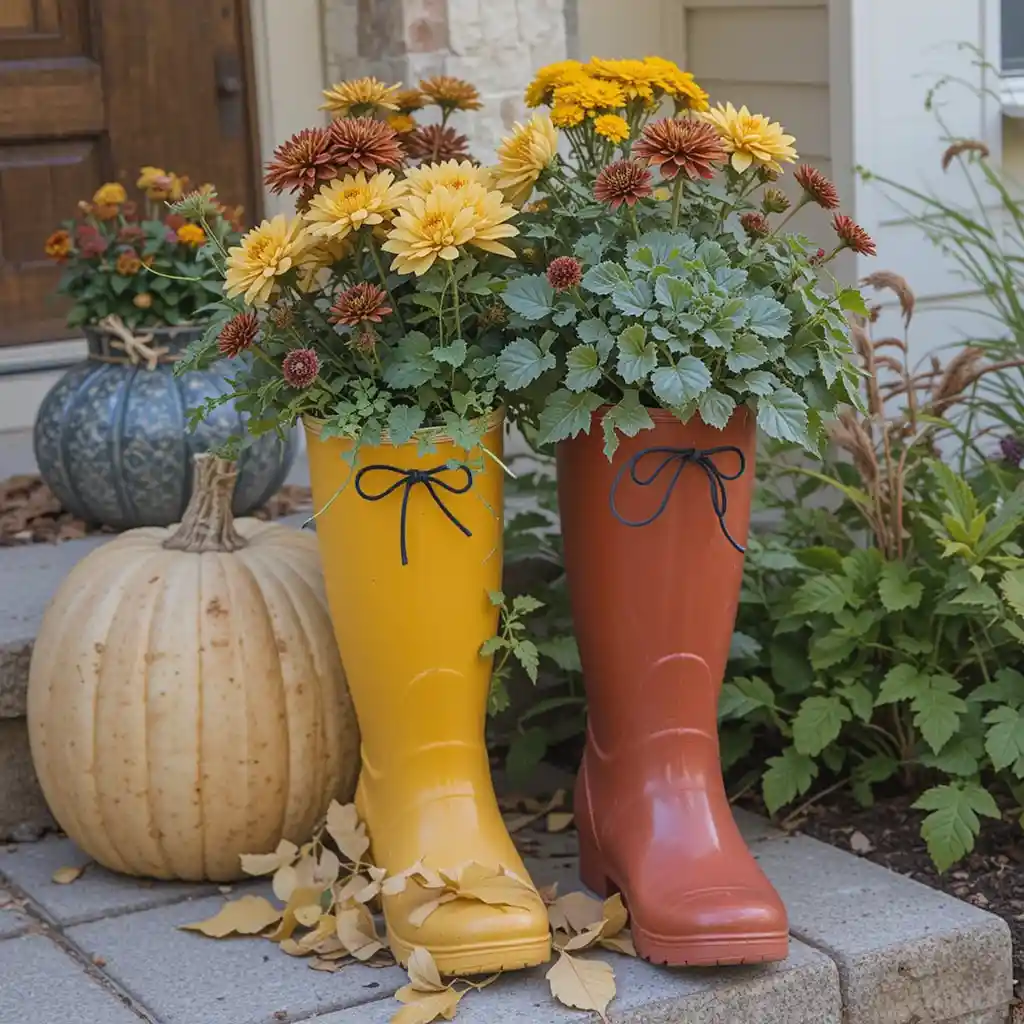 Repurpose old rain boots as planters for mums, ornamental kale, or pansies. This quirky idea adds a playful and unique flair to your autumn yard setup.