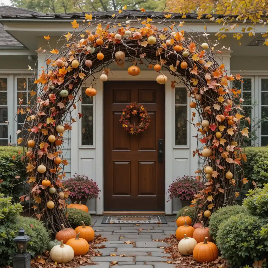 Create an arch with branches, leaves, and hanging gourds to frame your garden entry. This striking yard fall decoration brings a sense of enchantment to the outdoors.