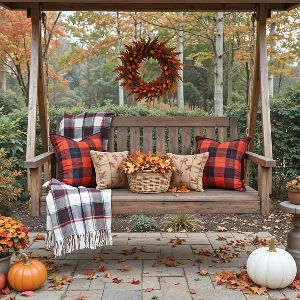 If you have a swing, dress it with plaid throws, pumpkin cushions, and a basket of leaves. It becomes a cozy focal point that embodies the warmth of fall.