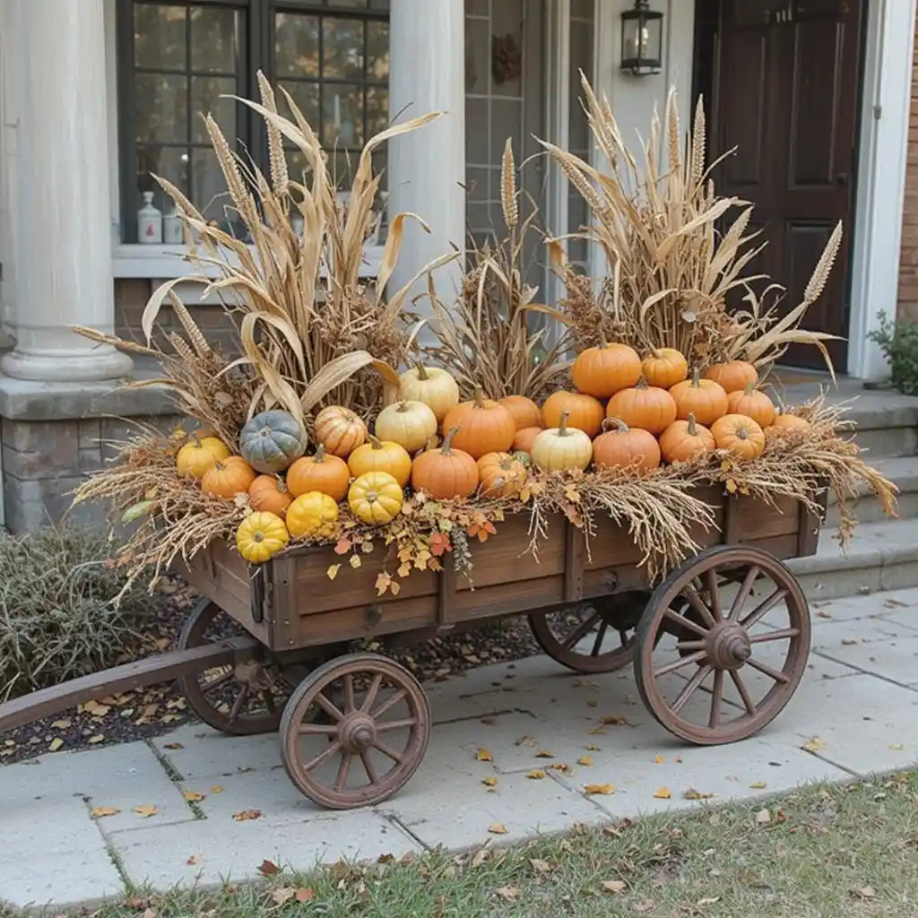 Repurpose an old wagon and fill it with colorful gourds, corn stalks, and dried leaves. This rustic yet vibrant display captures the abundance of the season.