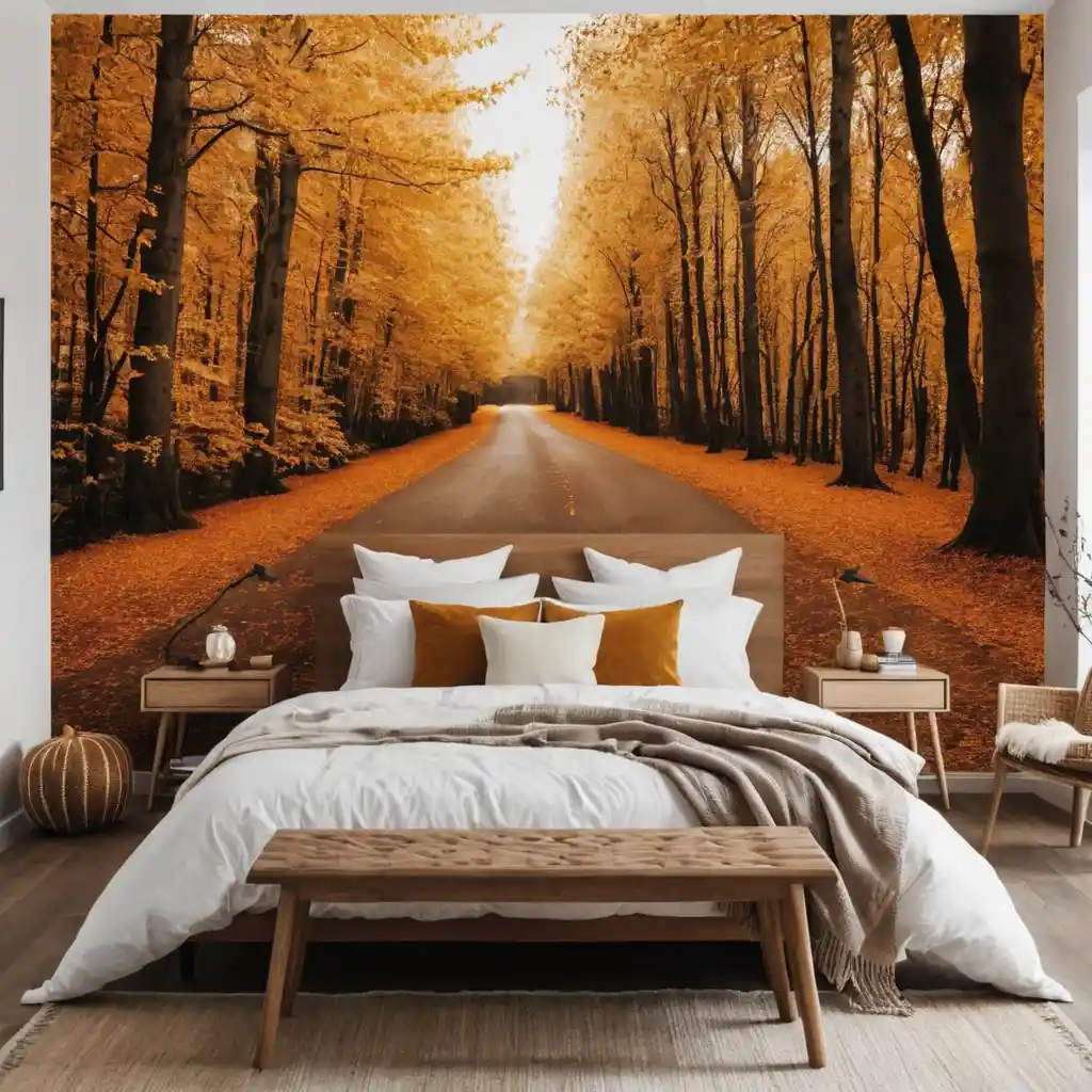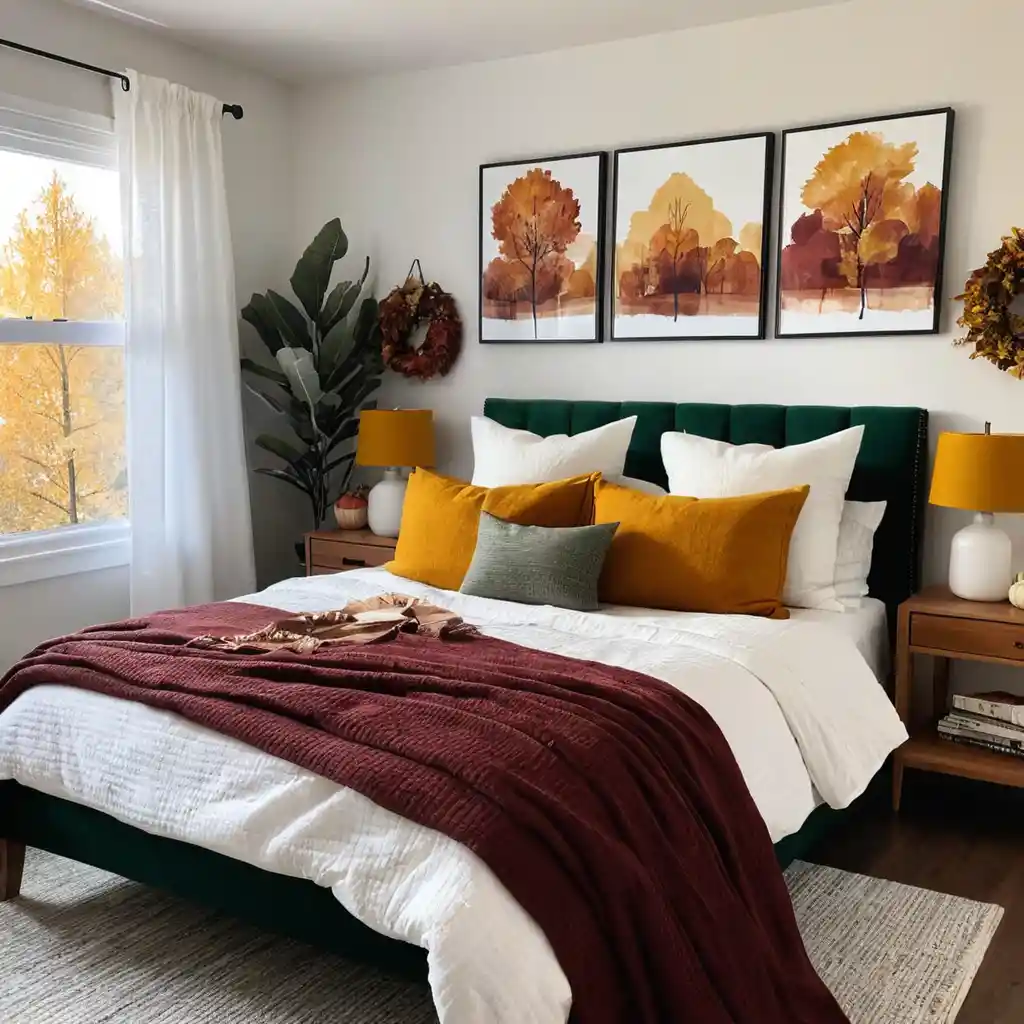 Autumn-themed prints, such as falling leaves or woodland scenes, create a seasonal focal point without being permanent. This is another fall bedroom decor idea that you can use.