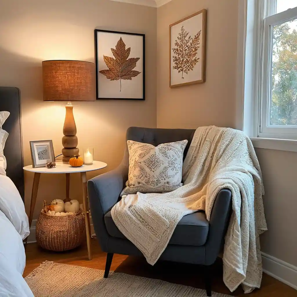 A corner with a cozy chair, fall blanket, and warm lamp gives your bedroom a snug retreat for chilly evenings.