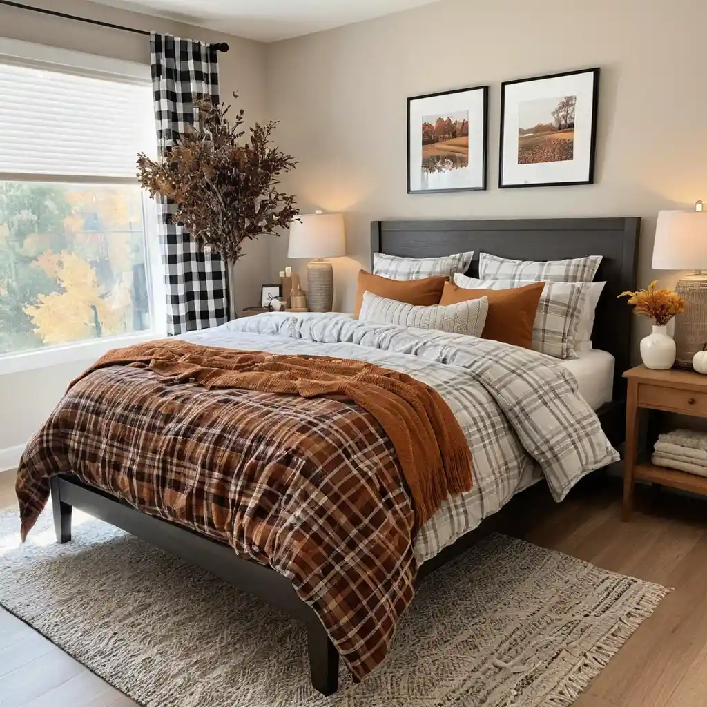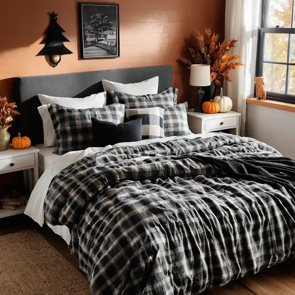 Plaid is the ultimate fall pattern—use it on bedding, throws, or pillow covers to create a timeless autumn aesthetic.