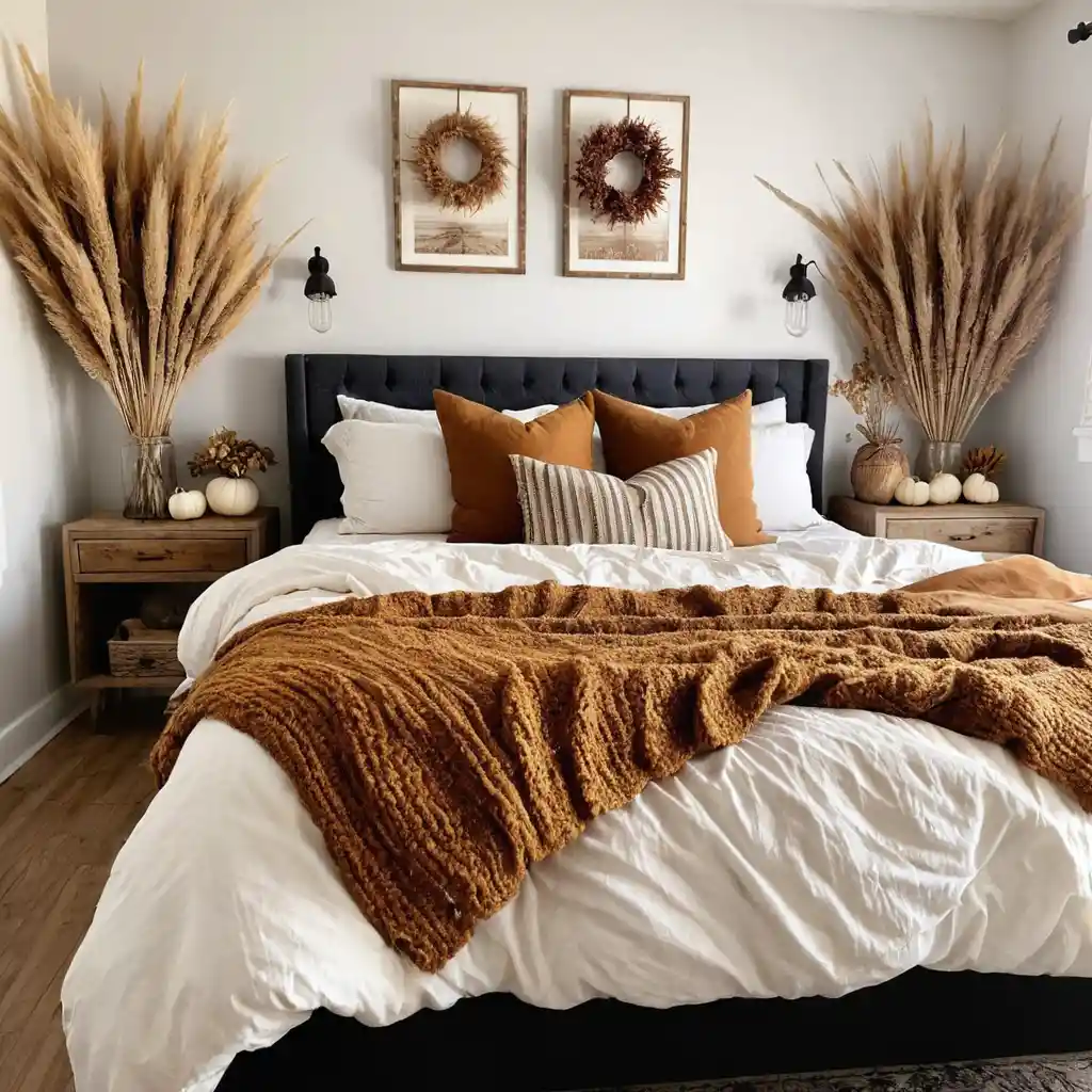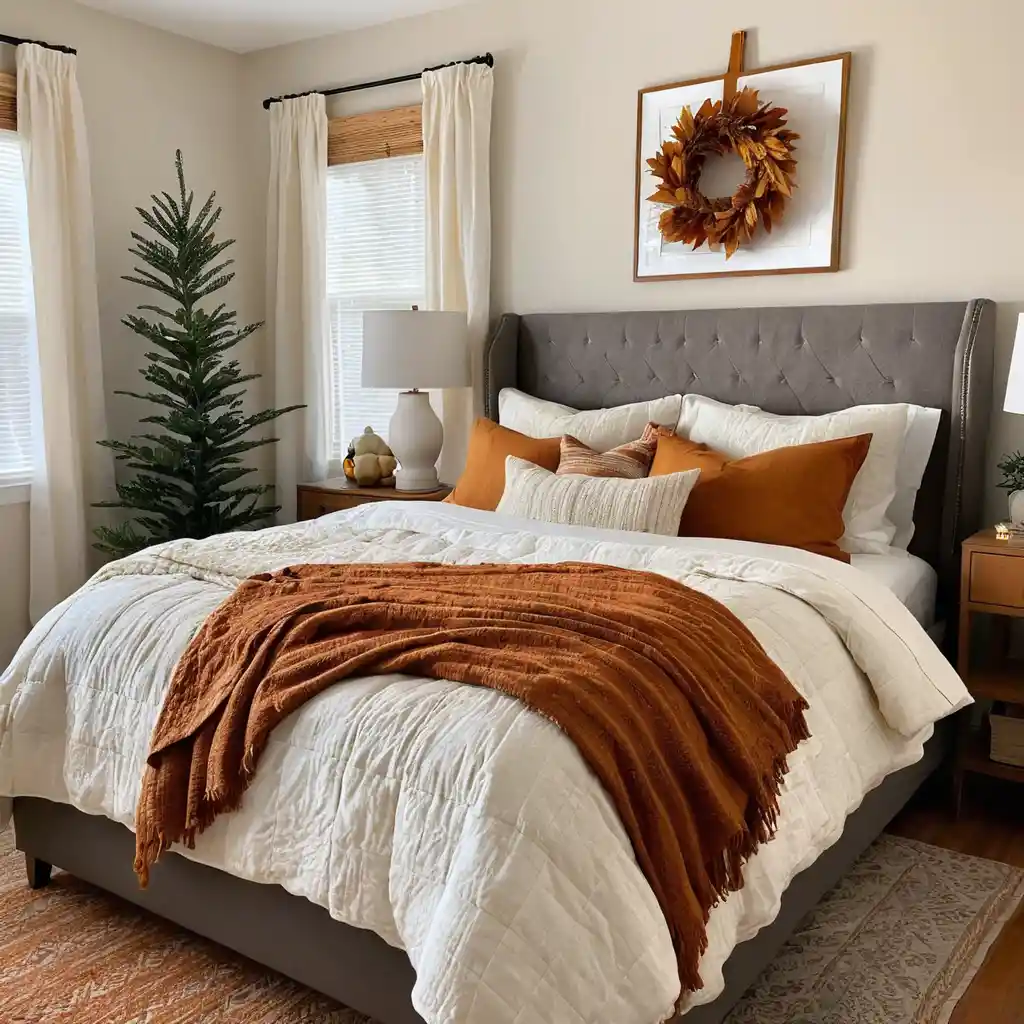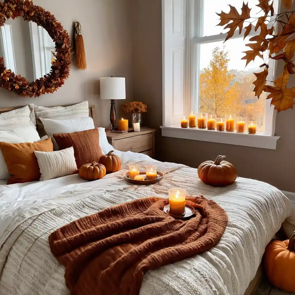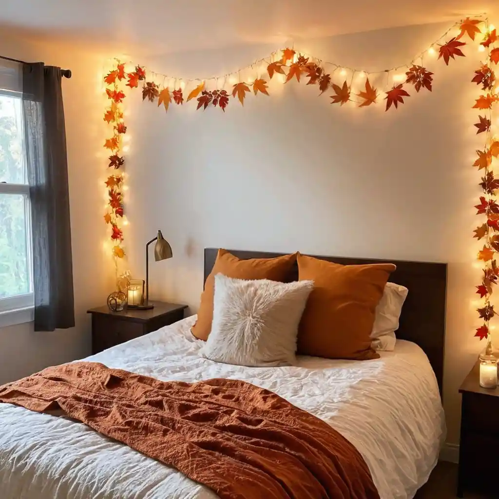 Warm fairy lights or golden-hued lamps make your bedroom glow with a welcoming autumn ambiance.