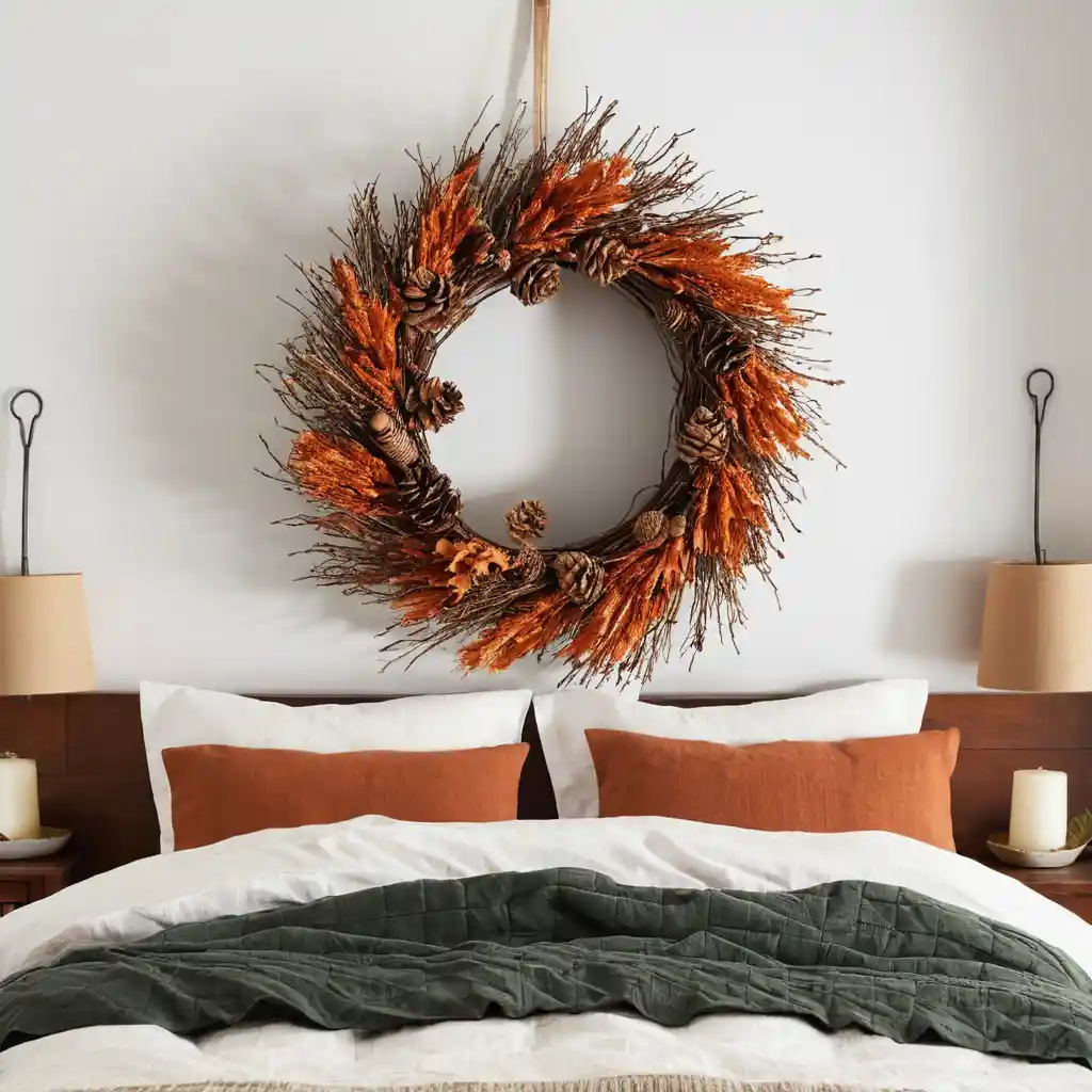 Wreaths aren’t just for doors—hang one made of twigs, pinecones, and leaves on a wall to add autumn flair – best fall bedroom decor.