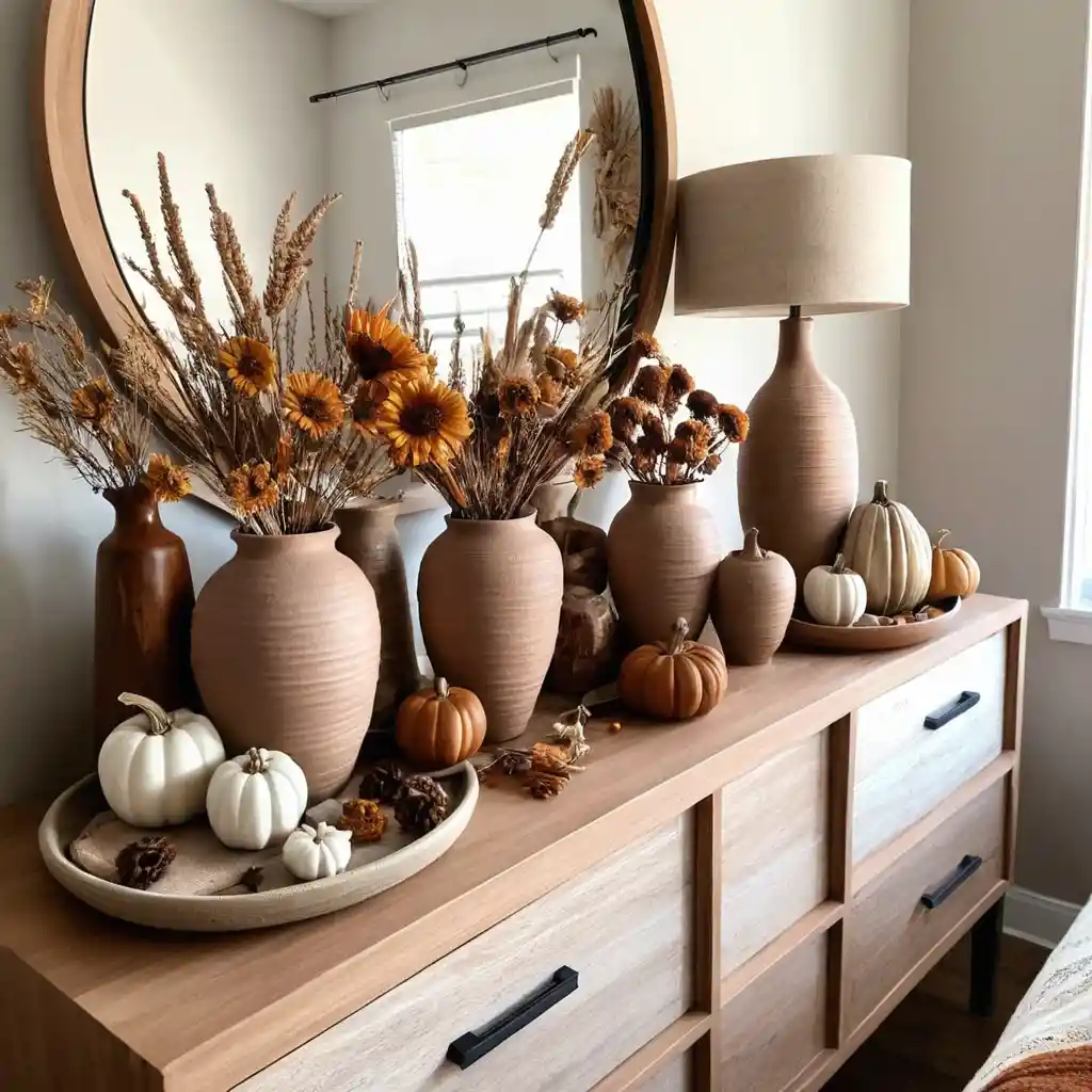 Clay or ceramic vases in earthy tones filled with dried flowers make a beautiful fall accent for your dresser or nightstand.