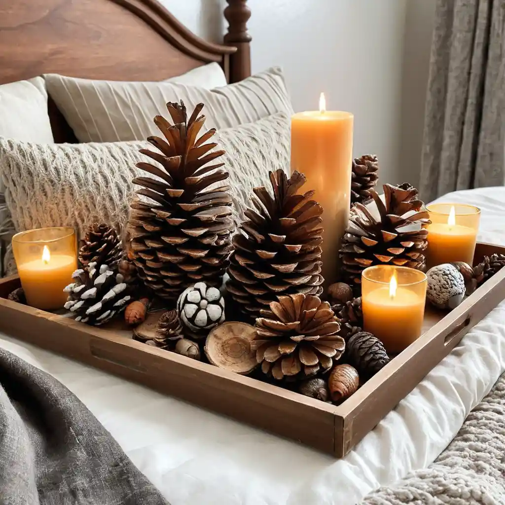 Pinecones, acorns, and wood slices can be styled on trays or shelves for subtle fall-themed decor.