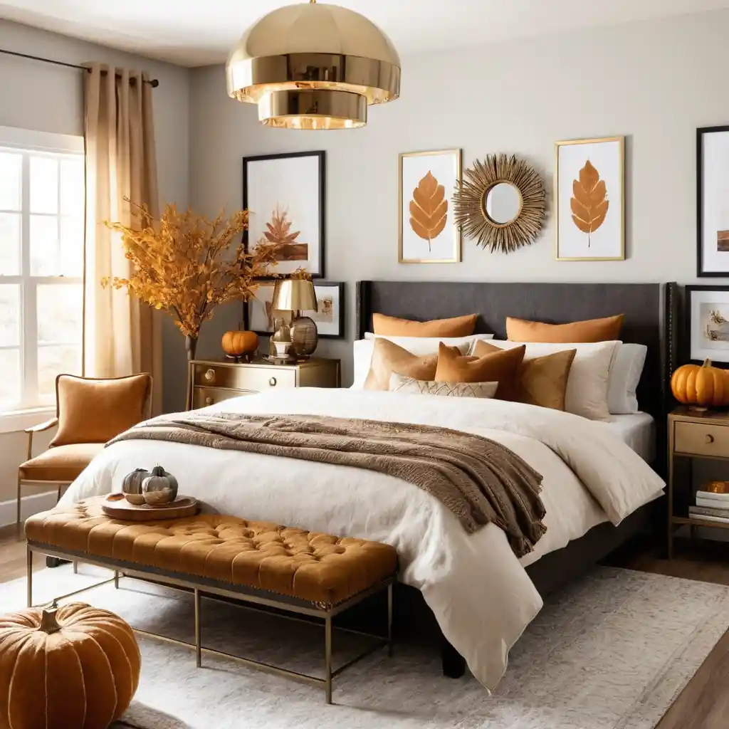 Touches of gold or bronze in lamps, picture frames, or mirrors reflect warm light and enhance the autumn glow.