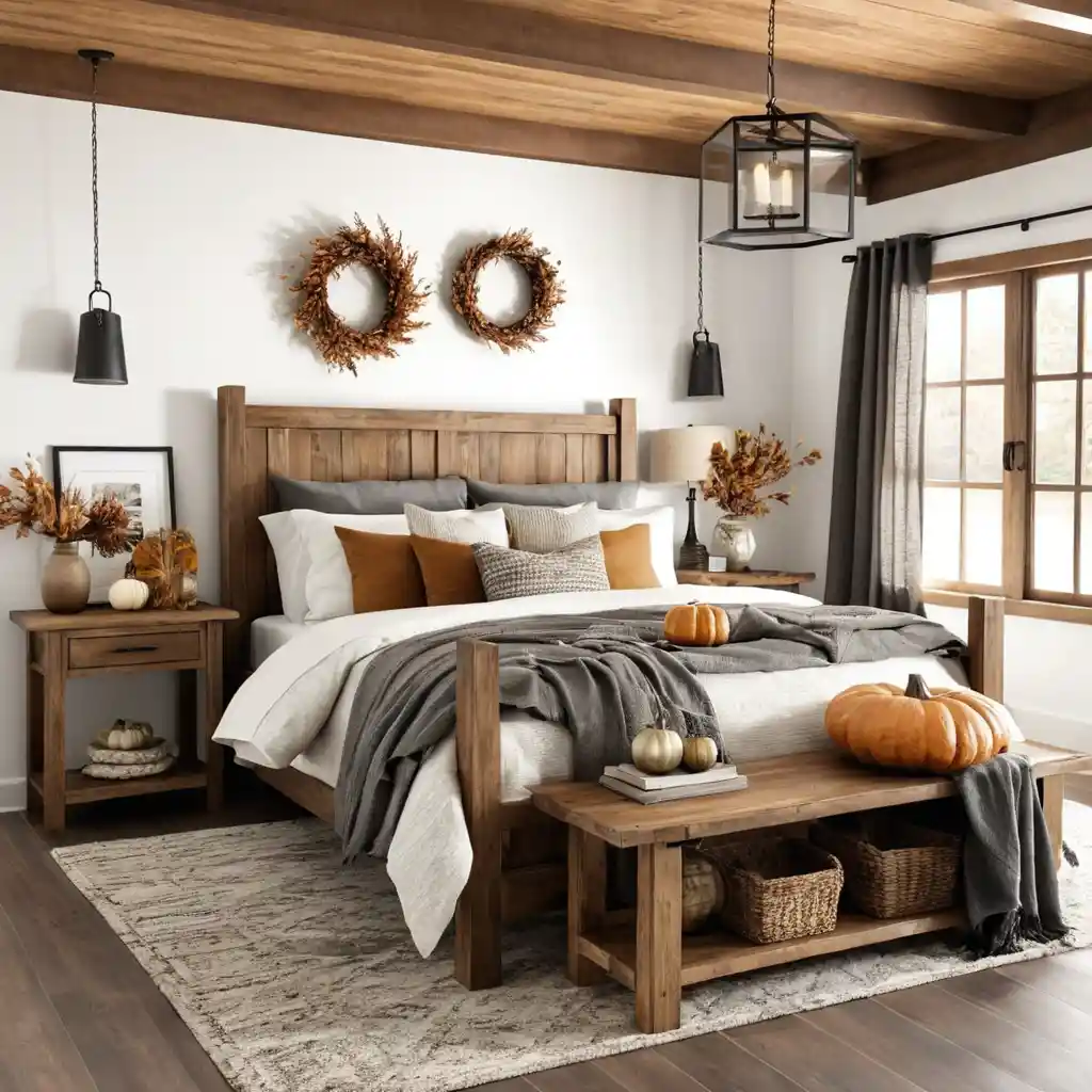 Adding wooden side tables, frames, or shelves creates a natural rustic aesthetic that feels in tune with the season. Sober fall bedroom decor design.