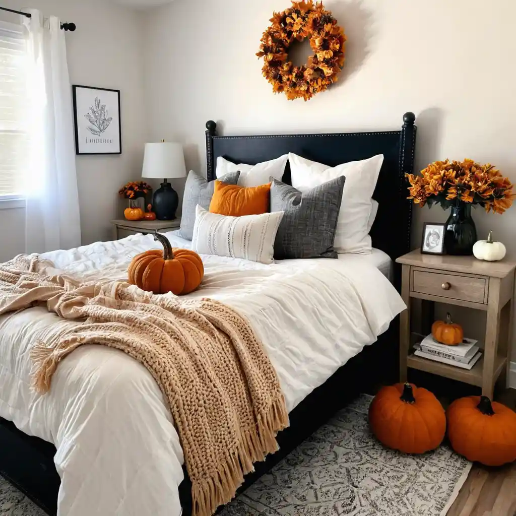 Mini pumpkins—real or faux—on nightstands or shelves instantly bring in a fall aesthetic without overwhelming the room.