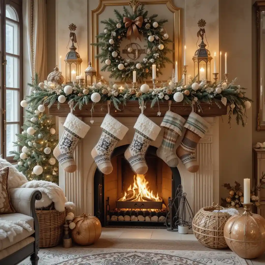 Draw inspiration from Swiss winters with woolen stockings, snowy white ornaments, and glowing lanterns. This cozy alpine theme radiates warmth and festive comfort.