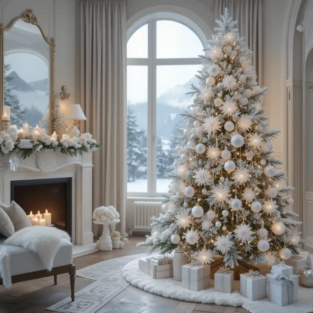 Think snow-capped mountains with soft whites, shimmering silver, and icy tones. Faux snow and delicate icicle ornaments give a refined winter wonderland touch.