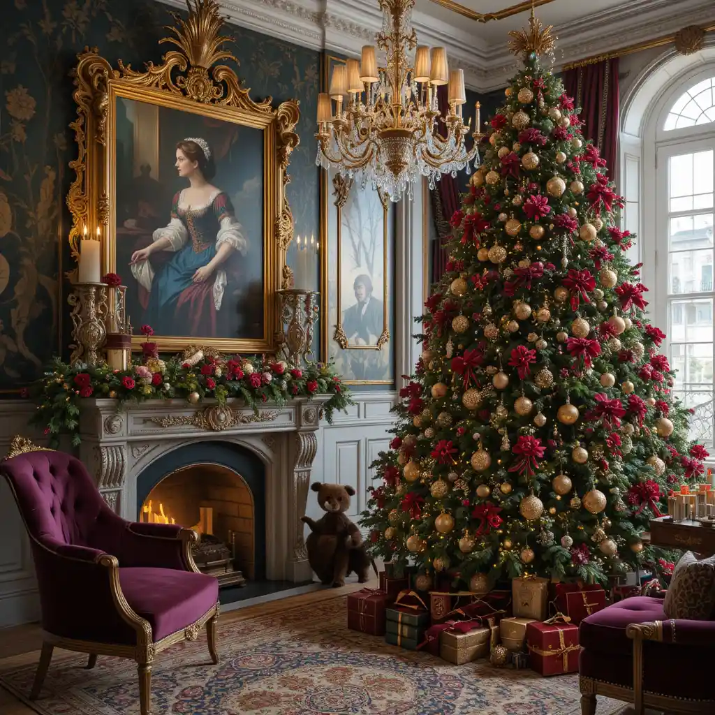 Bring Renaissance charm into your décor with deep jewel tones, velvet accents, and ornate golden frames. A tree with luxurious detailing gives your space a majestic, old-world richness.