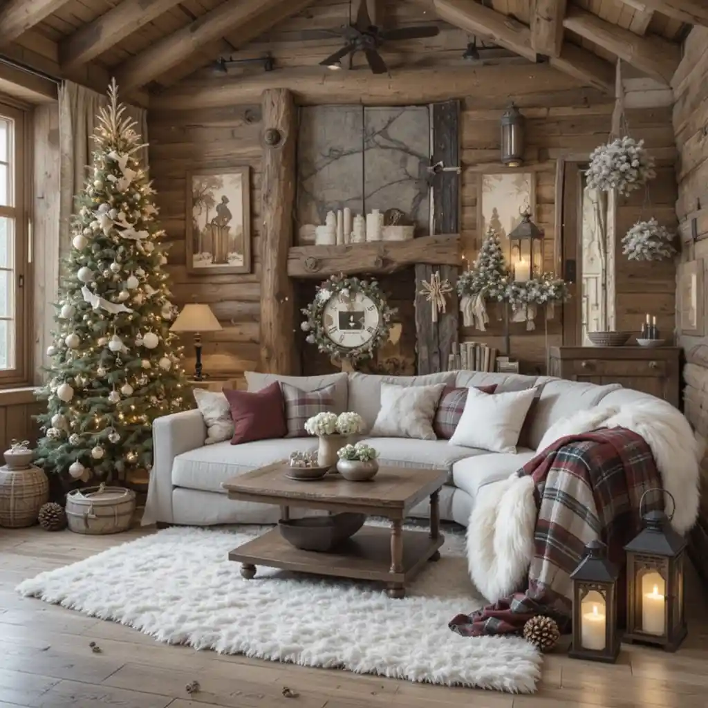 Recreate the ambiance of snowy mountain cabins with wooden textures, faux fur throws, and lanterns. Pinecones and tartan fabrics add to the warm, alpine-inspired atmosphere.