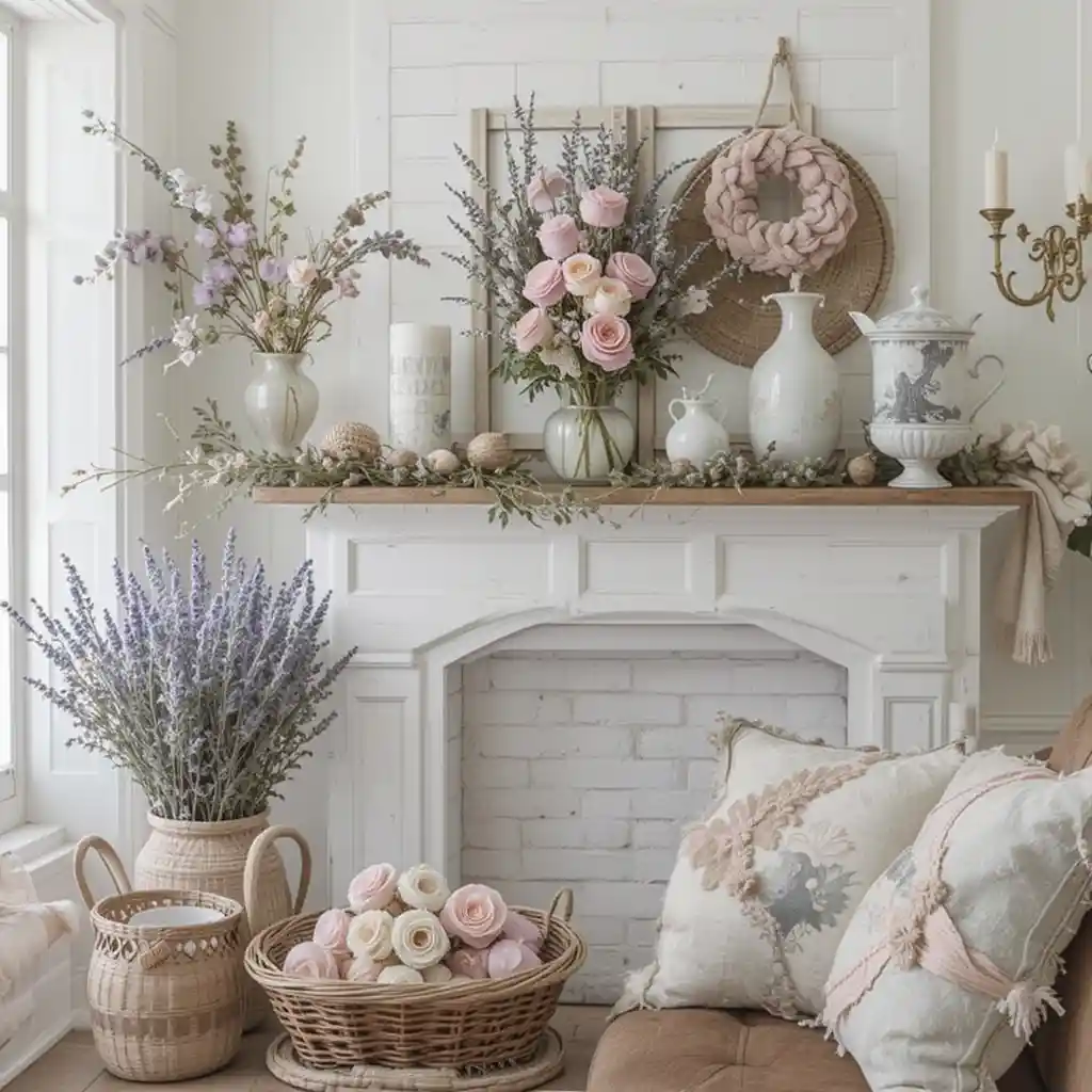 Soft pastels, lavender sprigs, and rustic baskets create a charming farmhouse effect. This French countryside-inspired theme adds an airy, gentle, and inviting aesthetic to your home.