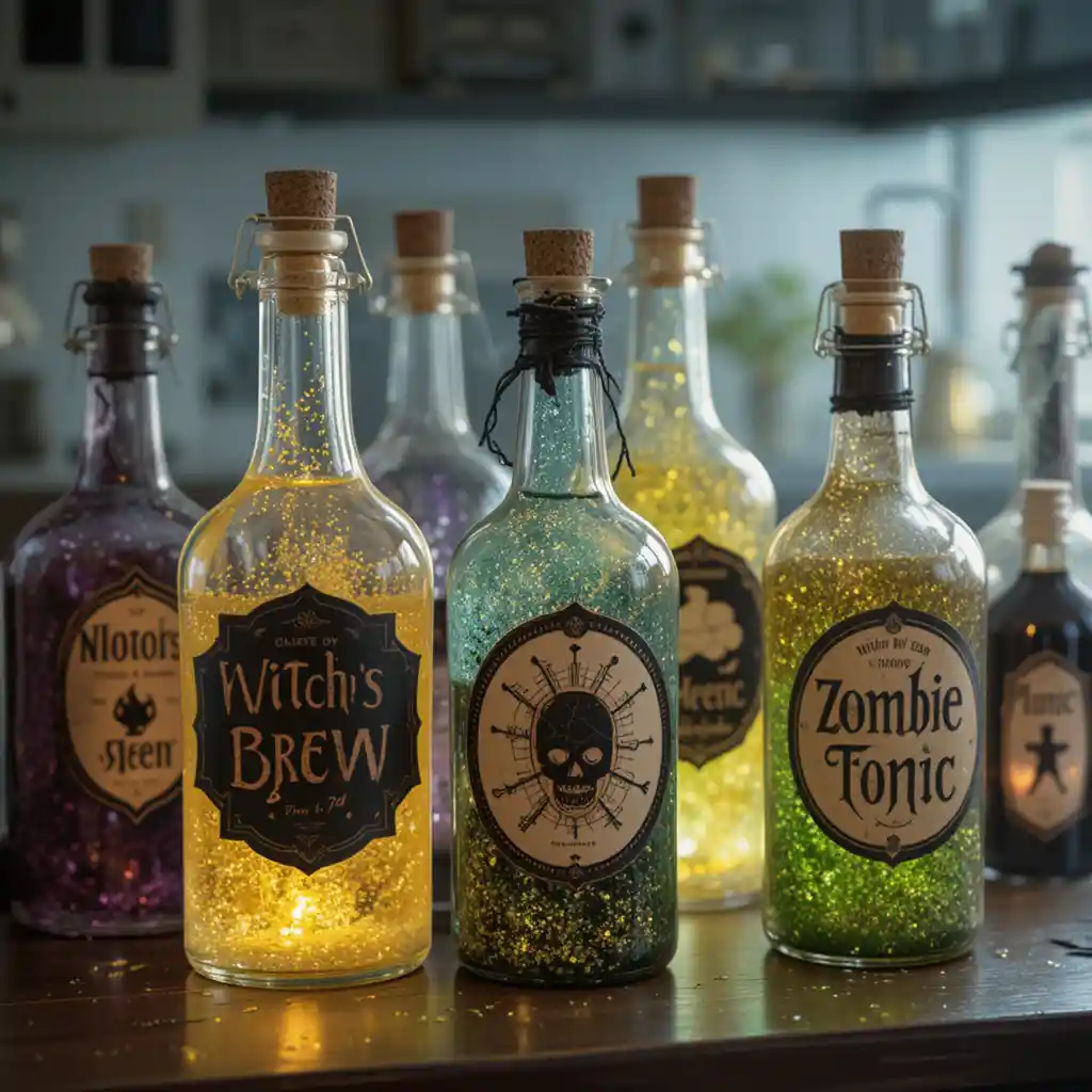 Fill glass bottles with colored water, glitter, or labels like “Witch’s Brew” and “Zombie Tonic.” Place them on shelves or the kitchen counter for a mysterious Halloween effect.