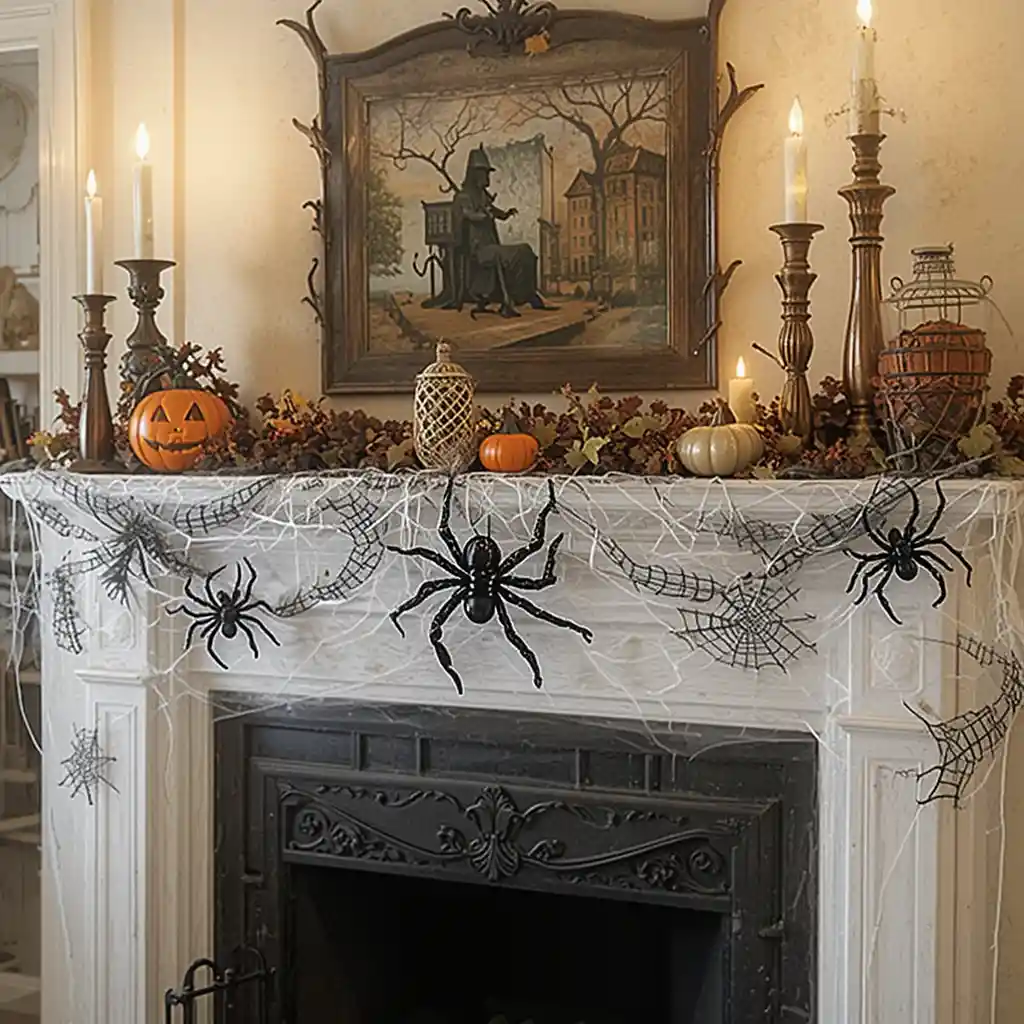 Stretch fake spider webs across your fireplace mantel or bookshelves. Add a few oversized plastic spiders to make the decoration stand out and give a haunted-house vibe.