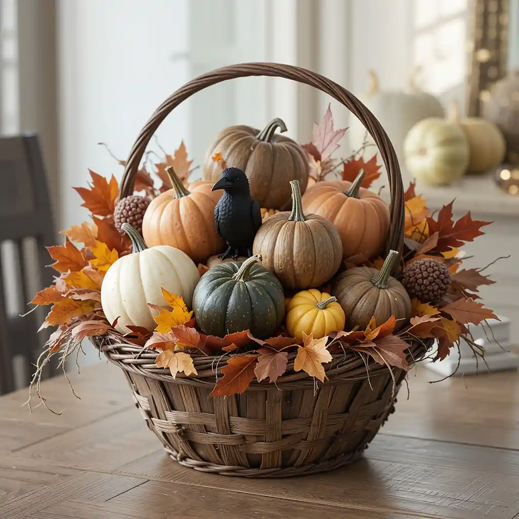 Fill a rustic basket with assorted gourds, fall leaves, and a touch of Halloween—like a black crow or small skeleton hand. Place it on tables, counters, or your entryway for a seasonal charm.