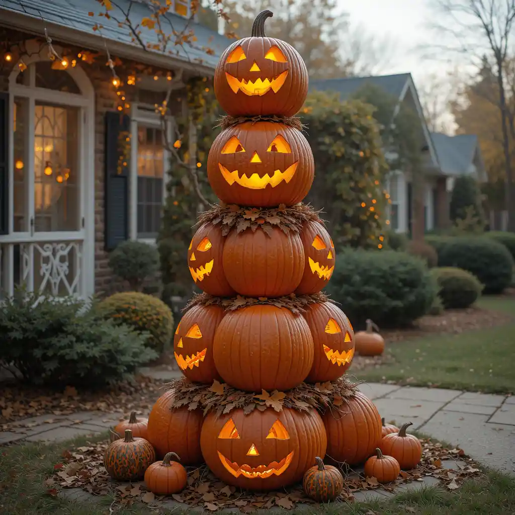 Stack carved pumpkins into a tall tower for a dramatic Halloween statement piece. Secure them with dowels for stability, and let the glowing faces create a spooky fall landmark.