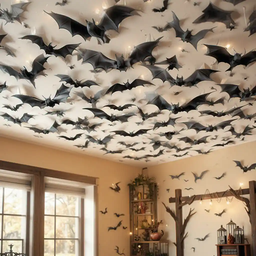 Cut bat shapes from black cardstock and stick them to the ceiling or walls, creating a flying swarm effect. The shadowy bats look amazing against warm autumn lights.